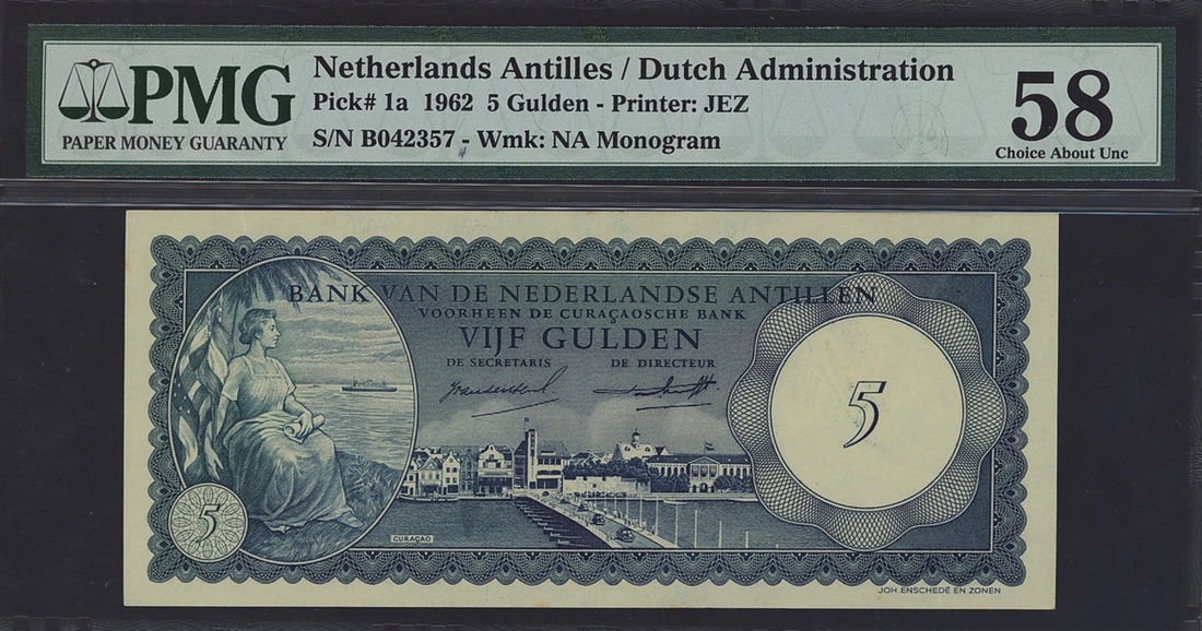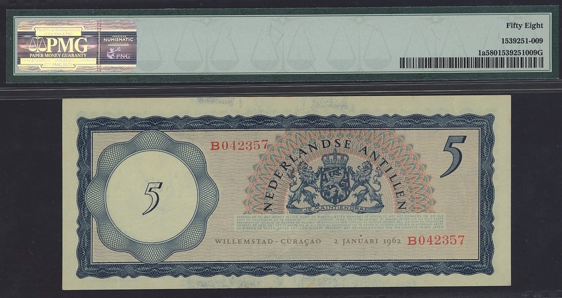 (x) Netherlands Antilles, 5 gulden, 1962, serial number B042357, (Pick 1a), in PMG holder 58 Choice About Uncirculated