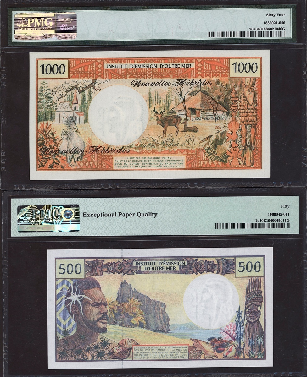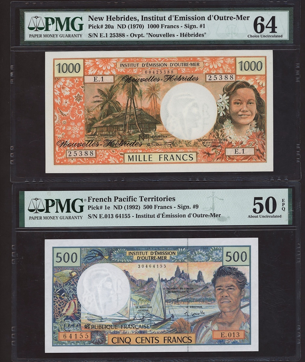 (x) Institut d'Emission d'Outre-Mer, New Hebrides, French Pacific Territories, Pair of 1000 & 500 francs, ND (1970), ND (1992), (Pick 20a, 1e), In PMG holder 64 EPQ Choice Uncirculated, 50 EPQ About Uncirculated, (2 notes).
