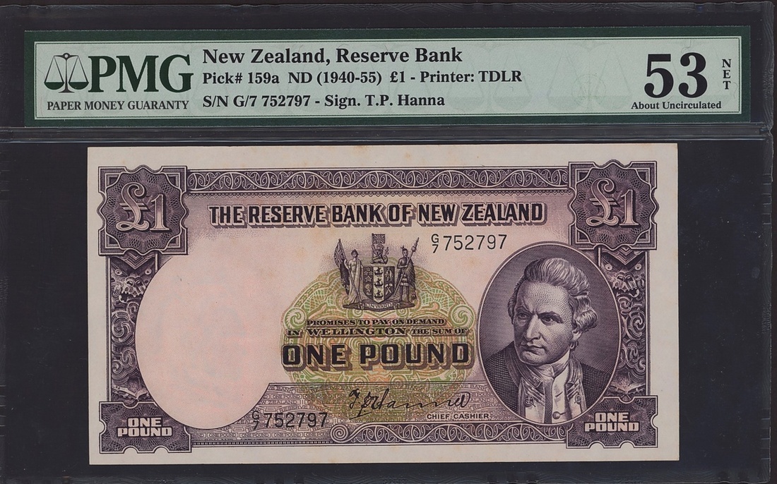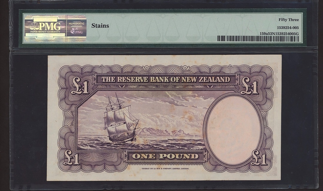 (x) The Reserve Bank of New Zealand, £1, ND (1940-55), serial number G/7 752797, (Pick 159a), in PMG holder 53 NET, Stains, About Uncirculated