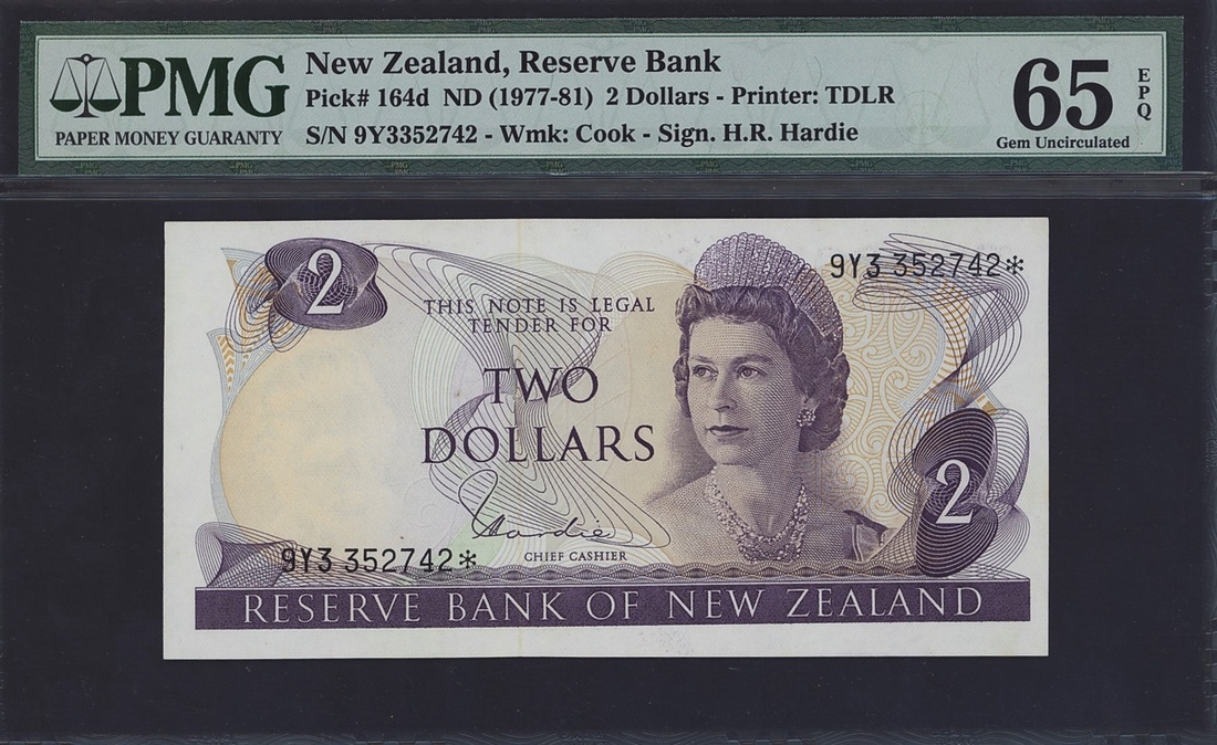 (x) Reserve Bank of New Zealand, 2 dollars, ND (1977-81), serial number 9Y3352742, (Pick 164d), in PMG holder 65 EPQ Gem Uncirculated