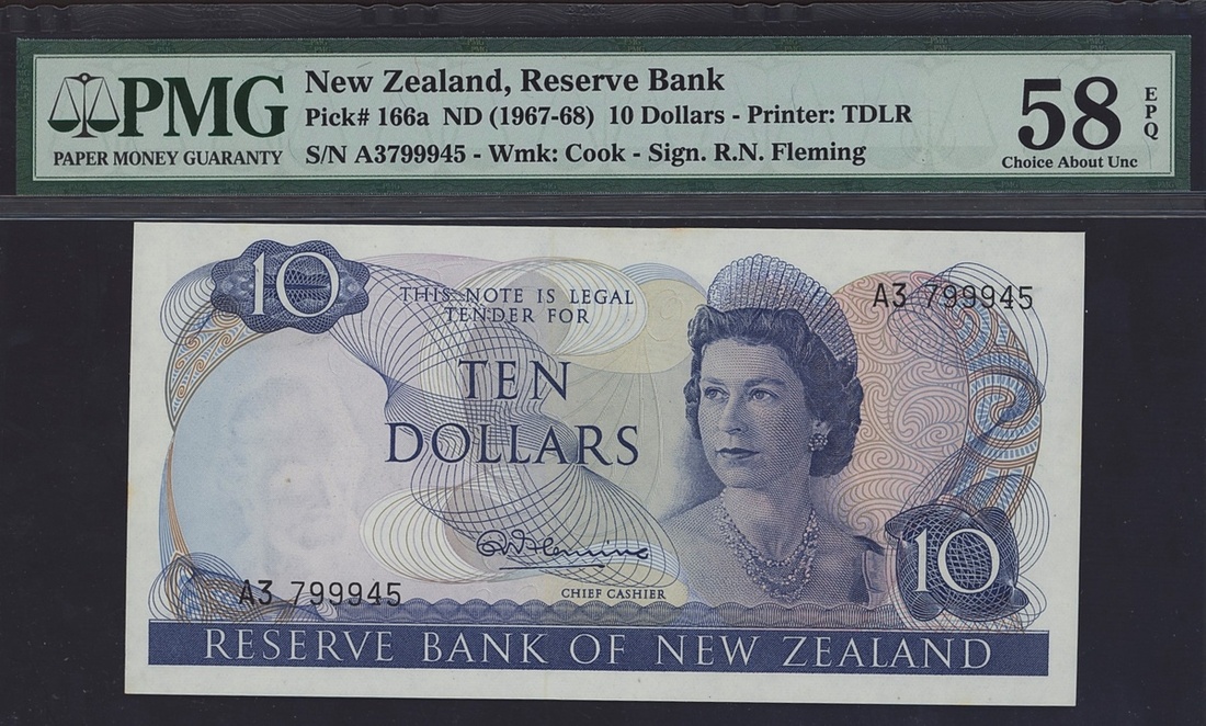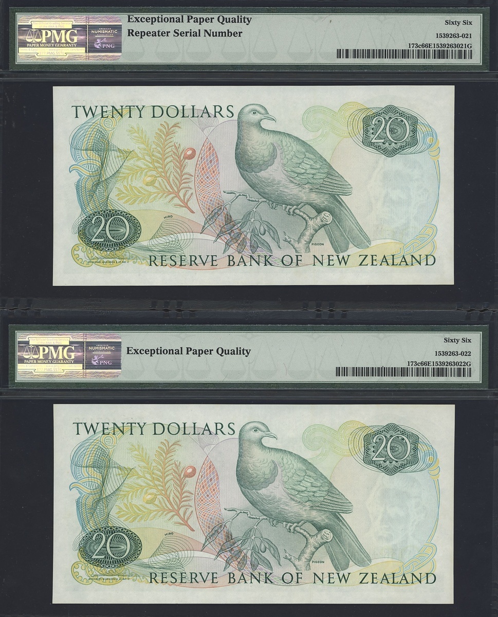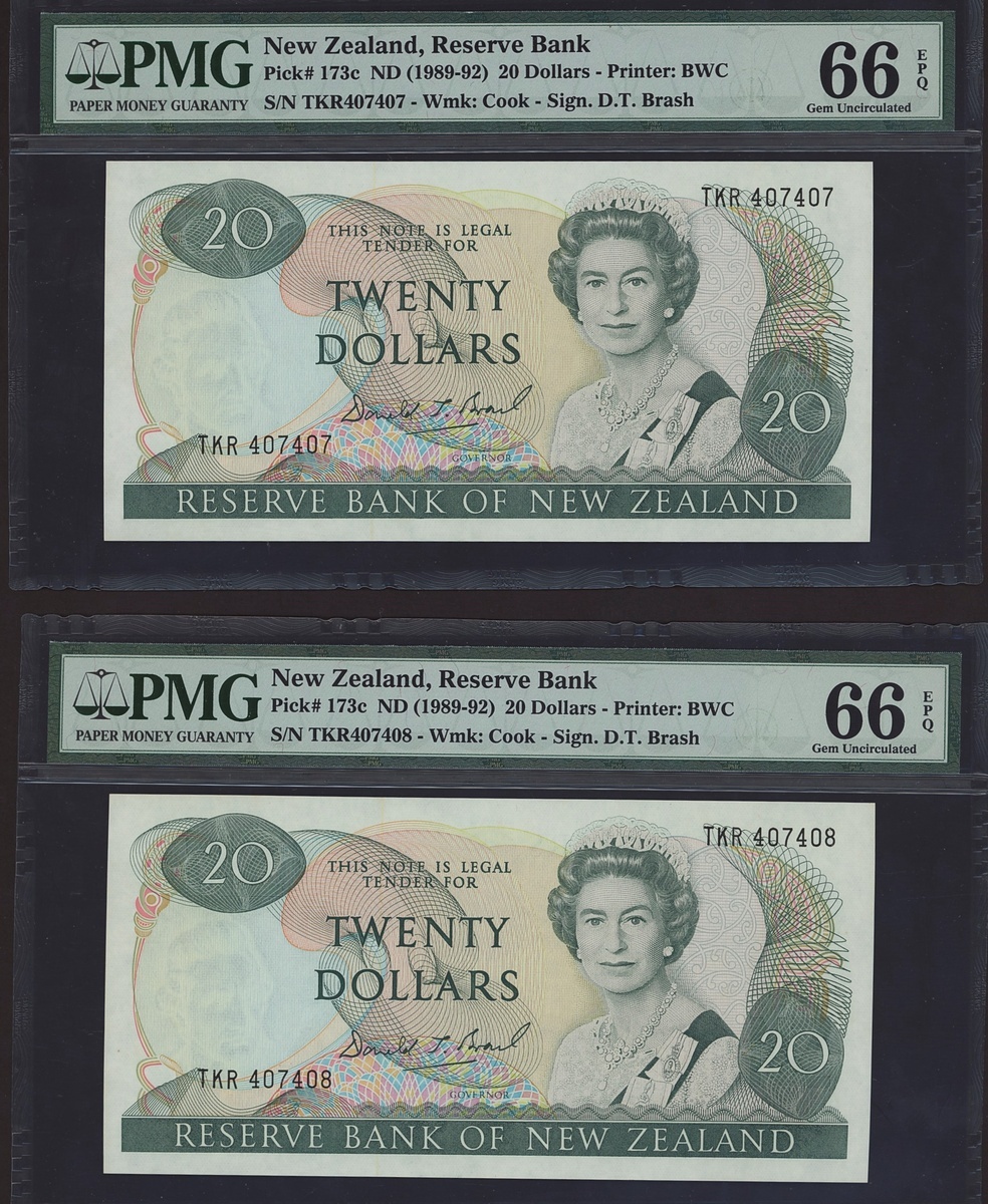 (x) Reserve Bank of New Zealand, consecutive pair 20 dollars, ND (1982-92), serial numbers TKR 407407/08, also a 10 dollars, ND (1967-68), prefix A3,