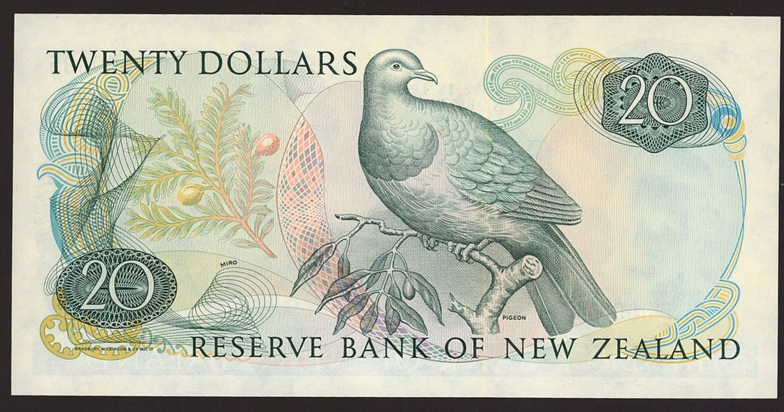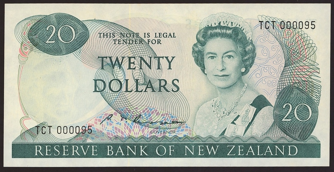 Reserve Bank of New Zealand, 20 dollars, ND (1985), serial number TCT 000095, (Pick 173b, B120b), about uncirculated, low serial number.