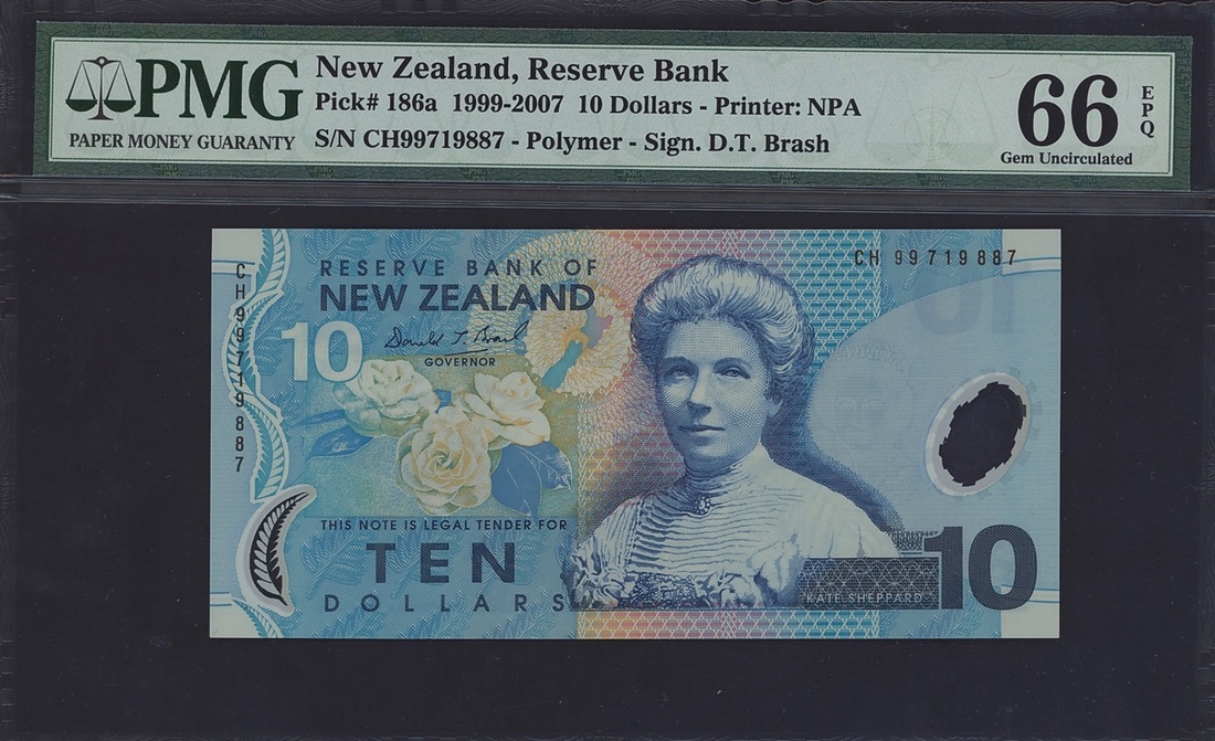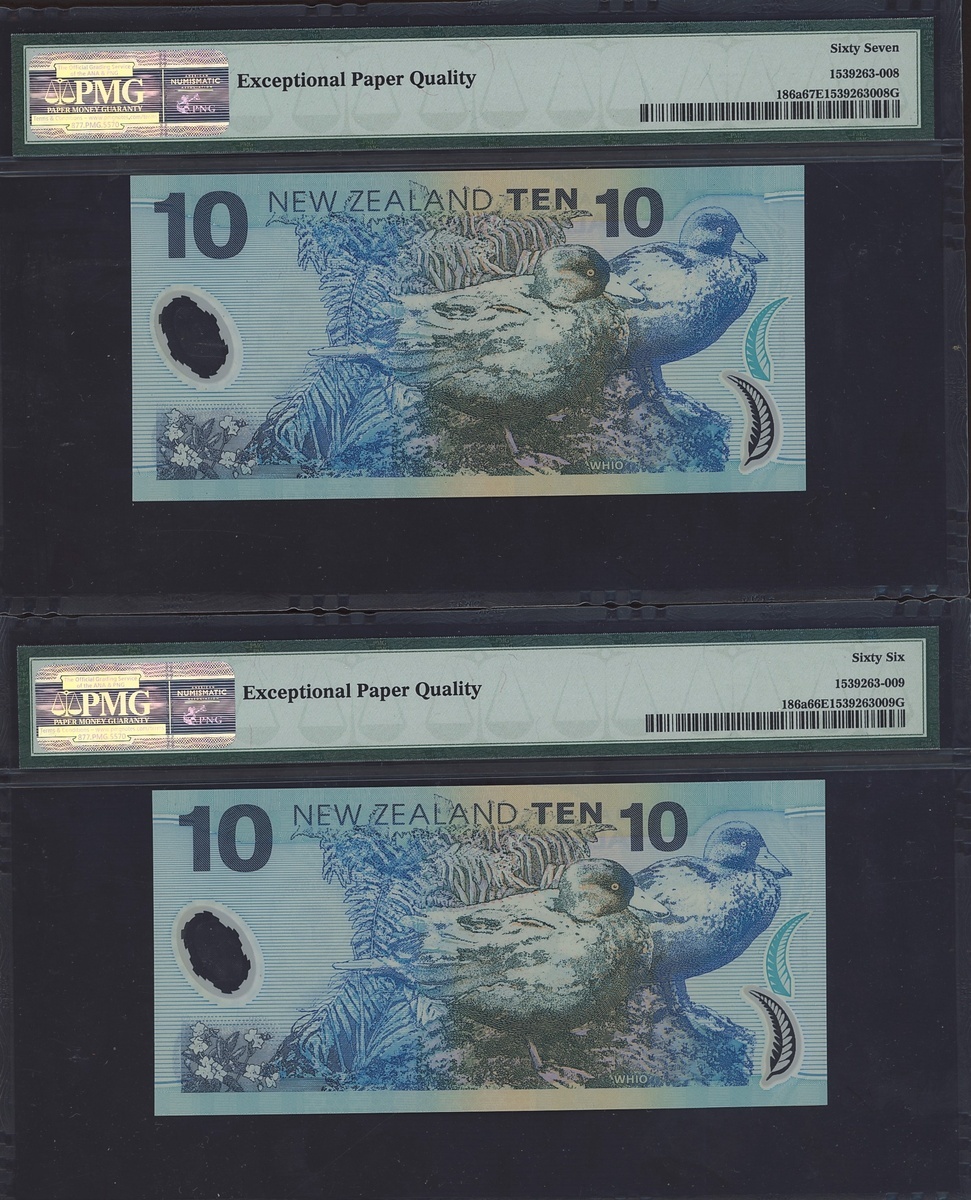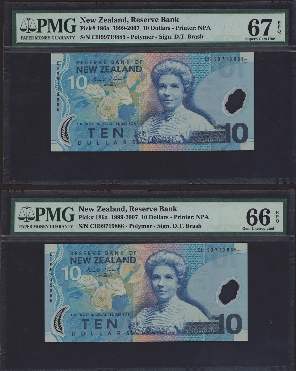 (x) Reserve Bank of New Zealand, consecutive 10 dollars (3), 1999, serial numbers CH99719885/6/7, (Pick 186a), in PMG holders 67 EPQ Superb Gem Unc, 66 EPQ Gem Uncirculated (3 notes)