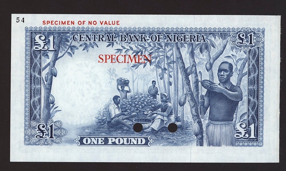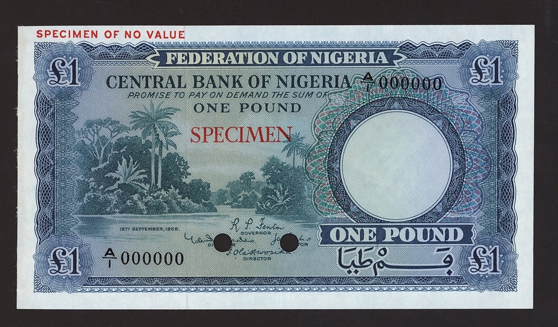 Central Bank of Nigeria, colour trial specimen £1, 1958, serial number A/1 000000, (Pick 4cts), previously mounted, otherwise about uncirculated