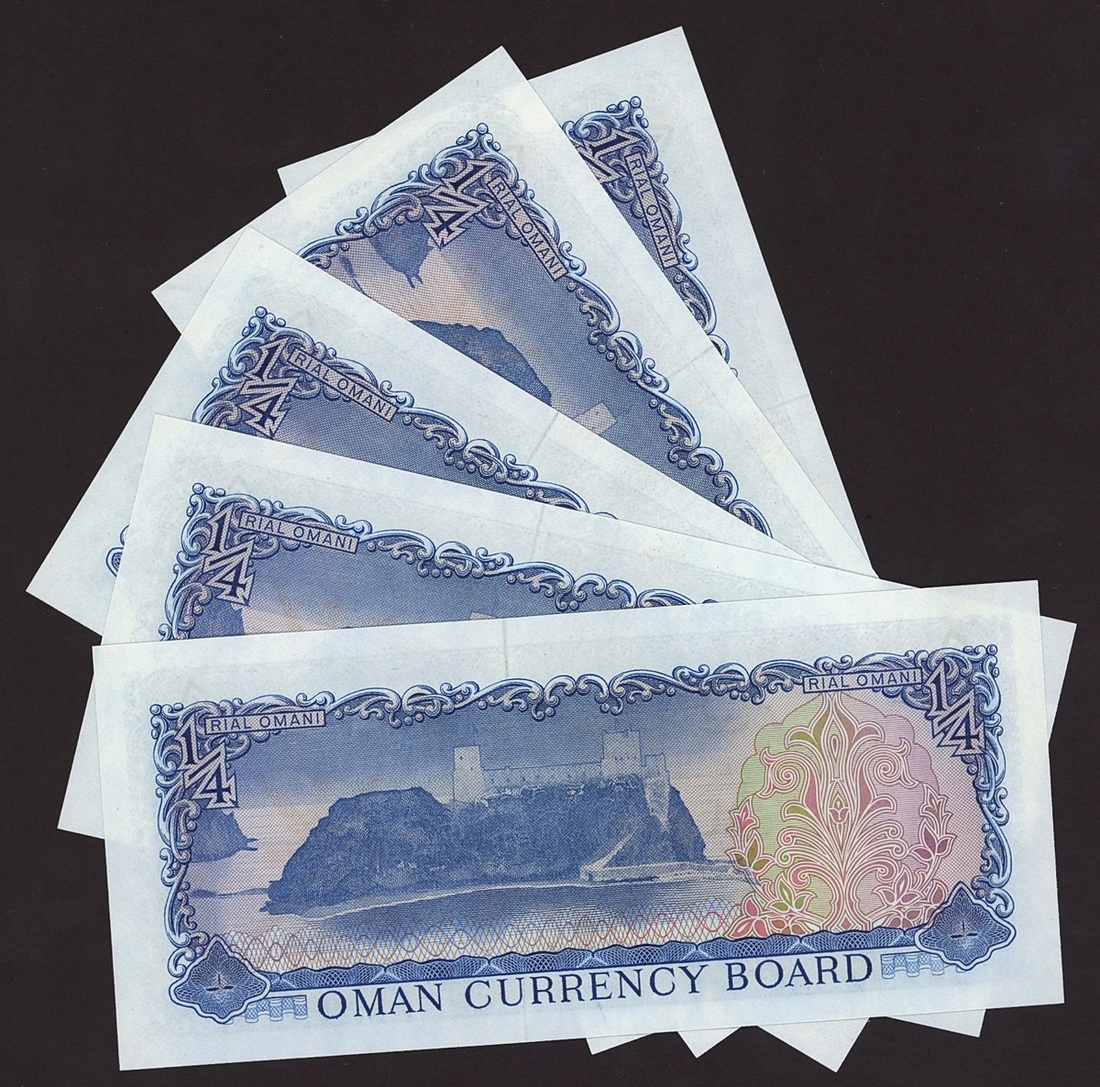(x) Oman Currency Board, consecutive 1/4 rial omani, 1972, serial number 549724 - 8, (Pick 8a), uncirculated (5 notes)