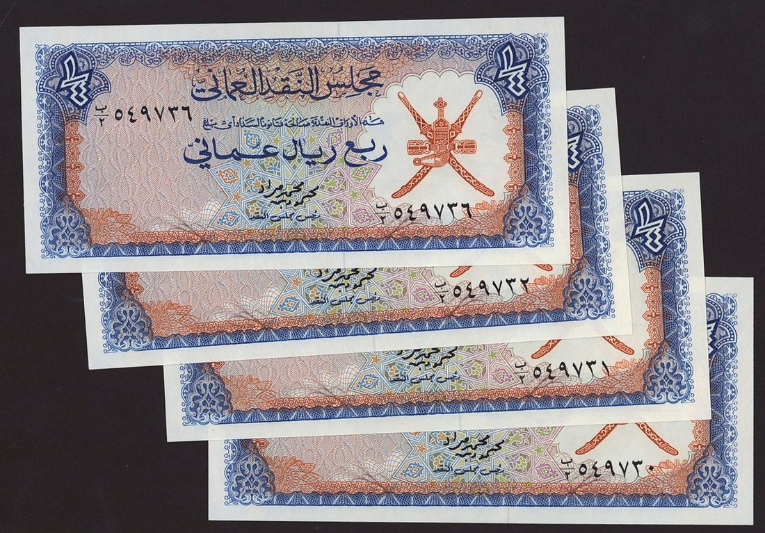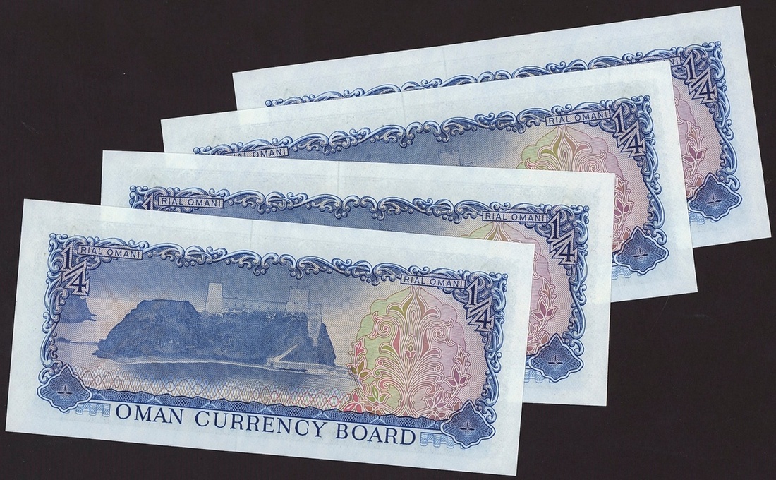 (x) Oman Currency Board, 1/4 rial omani, 1972, serial number 549730, 1, 2, 6, (Pick 8a), some consecutive, uncirculated (4 notes)
