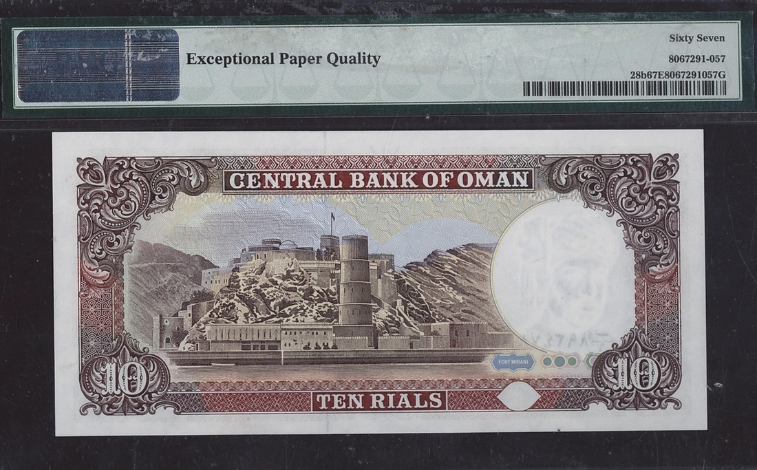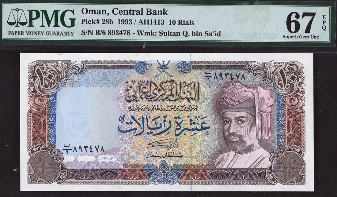 (x) Central Bank of Oman, 10 rials, 1993, serial number B/6 893478, (Pick 28b), in PMG holder 67 EPQ Superb Gem Uncirculated