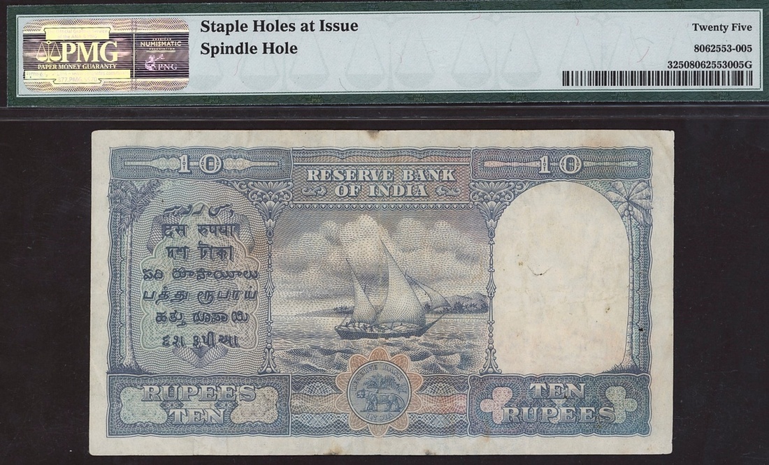 (x) Government of Pakistan, 10 rupees, ND (1948), serial number J/21 055570, (Pick 3), in PMG holder 25 Very Fine, staple holes at issue, spindle hole
