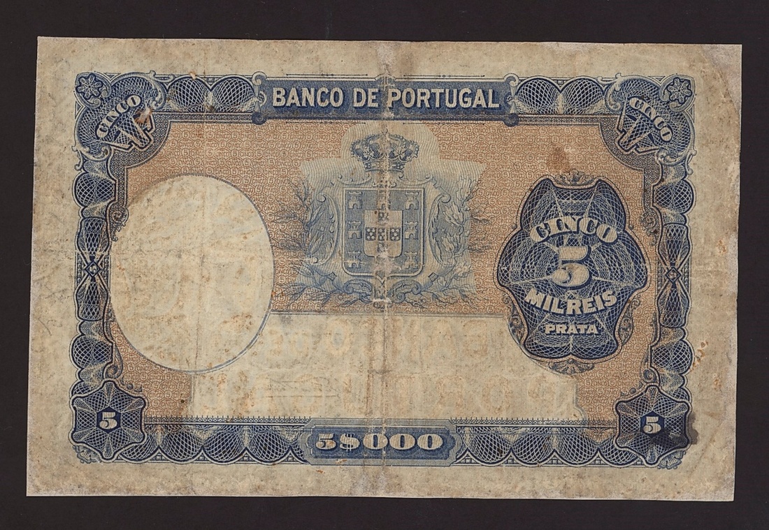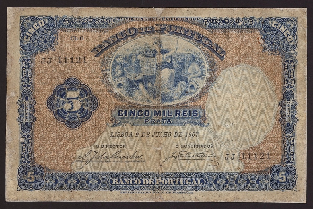(x) Banco de Portugal, 5 Mil Reis, 9 July 1907, Ch.6, serial number JJ 11121, blue and pale lilac brown, vignette of maiden (Portugal) and river gods in oval at upper centre, value in guilloche at left and in each corner, reverse coat of arms at upper centre, value in ornate guilloche at right