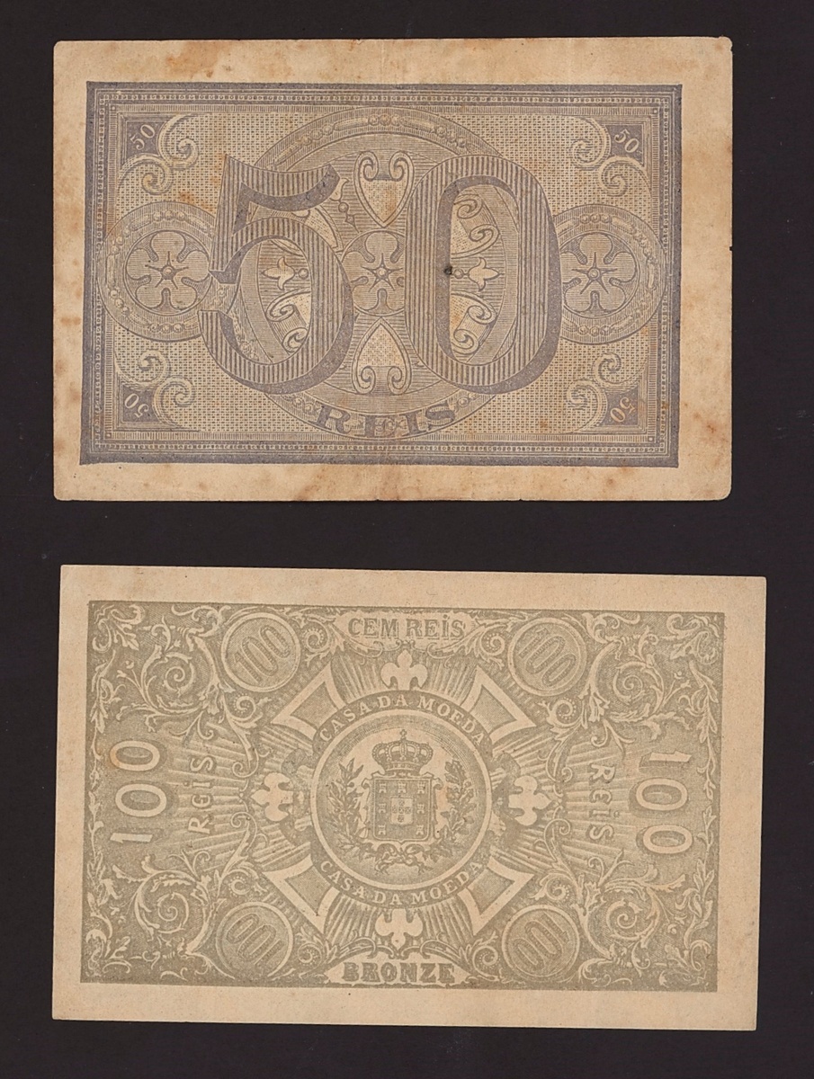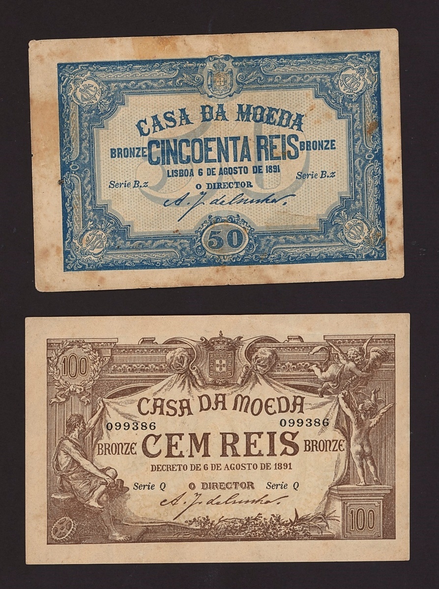 (x) Casa da Moeda, 50 reis, 6 August 1891, blue and white, arms top centre, value in oval frame low centre, also 100 reis, serial number 099386, brown and white, arms top centre, Hephaestion at left