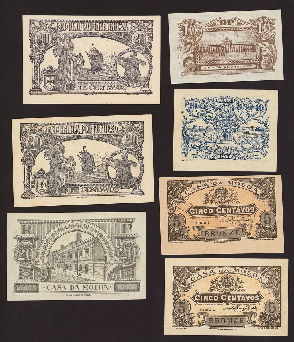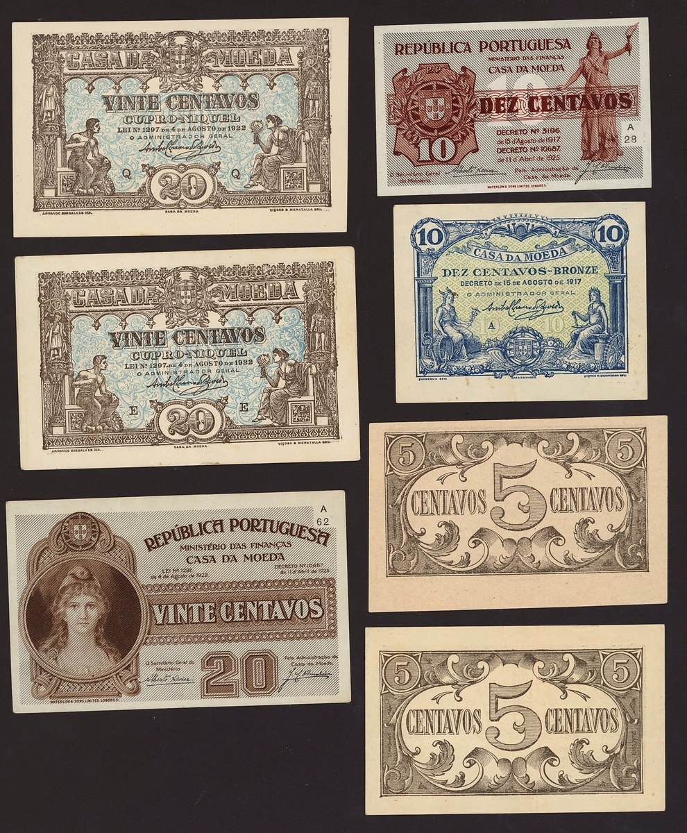 (x) Casa da Moeda, a selection of small value notes, 1918, comprising 5 centavos (2), yellow and brown, 10 centavos, 1917, blue and pale green, 20 centavos (2), 1922, brown, Republica Portuguesa, 10 centavos, 1925, red-brown, 20 centavos, 1922