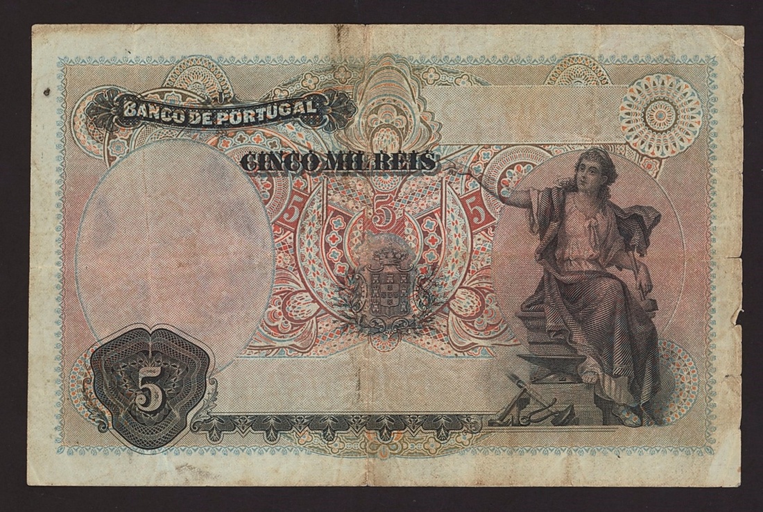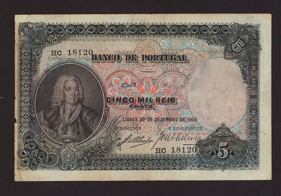 (x) Banco de Portugal, 5 Mil Reis, 30 December 1909, serial number HC 18120, black on blue and multicolour underprint, portrait Marquez de Pombal at left, reverse arms at centre, woman seated at right