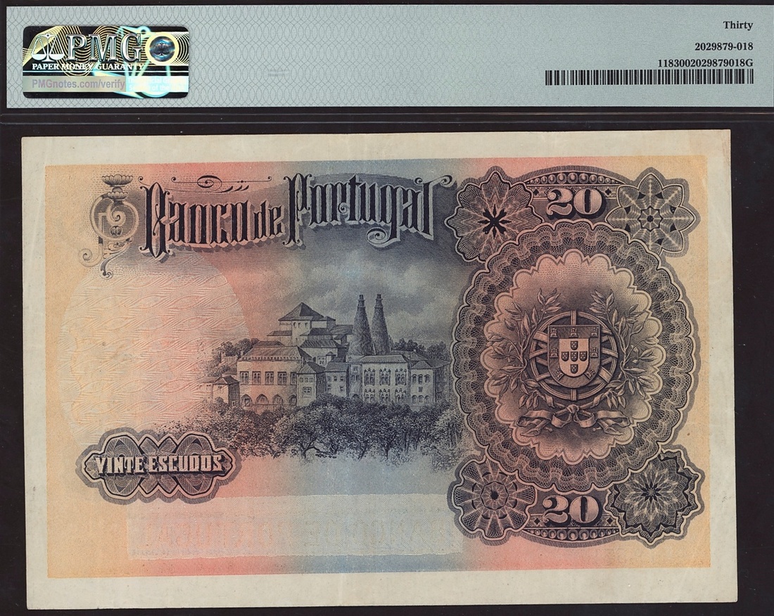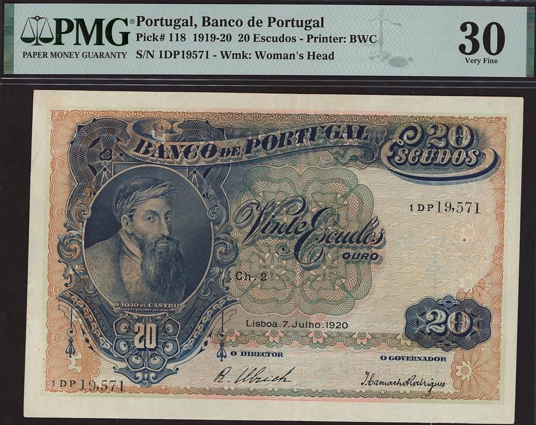 (x) Banco de Portugal, 20 escudos, 7 June 1920, Ch. 2, serial number 1 DP 19571, blue and pale green and pink, Joao de Castro at left, reverse blue and purple, buildings and arms