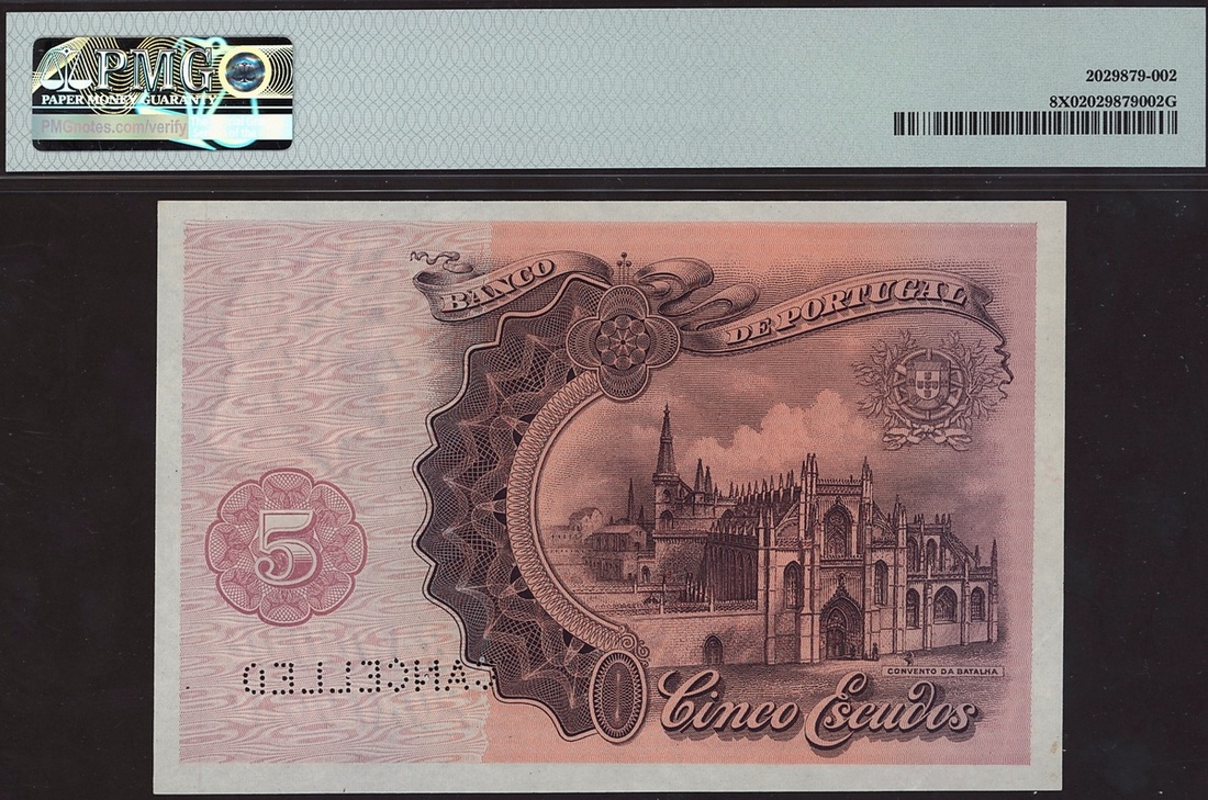 (x) Banco de Portugal, proof 5 escudos, ND (type of 1920), no serial numbers, purple on multicolour underprint, portrait J das Regras in ornate frame at centre left, bank title top centre, reverse, blue-grey, guilloche pattern at centre, Convento da Batalha at centre right