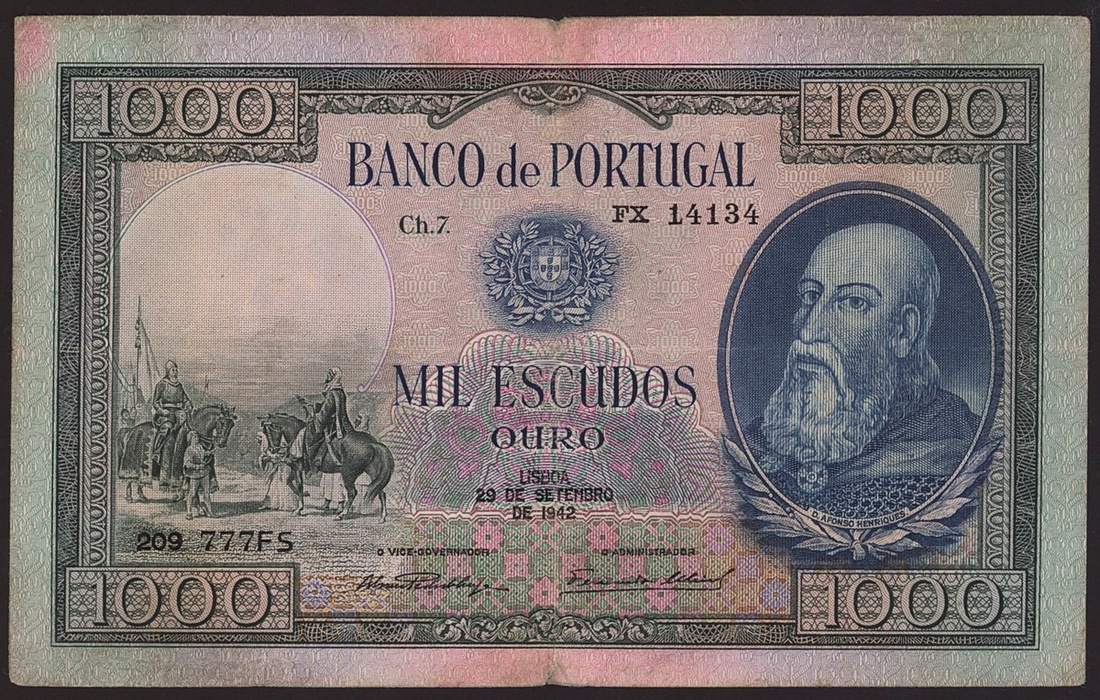 (x) Banco de Portugal, 1000 escudos, 28 September 1942, Ch 7, serial number FX 14134, green and blue and pink, D. Afonso Henriques in oval at right, knight and Arab on horseback at left, arms top centre, reverse green and pink and orange, Afonso Henriques's tomb in Coimbra
