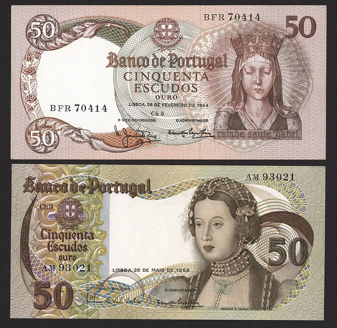 (x) Banco de Portugal, 50 escudos (2), 1964, 1968, Ch. 8, 9, brown and multicoloured, Queen Isabella at right
