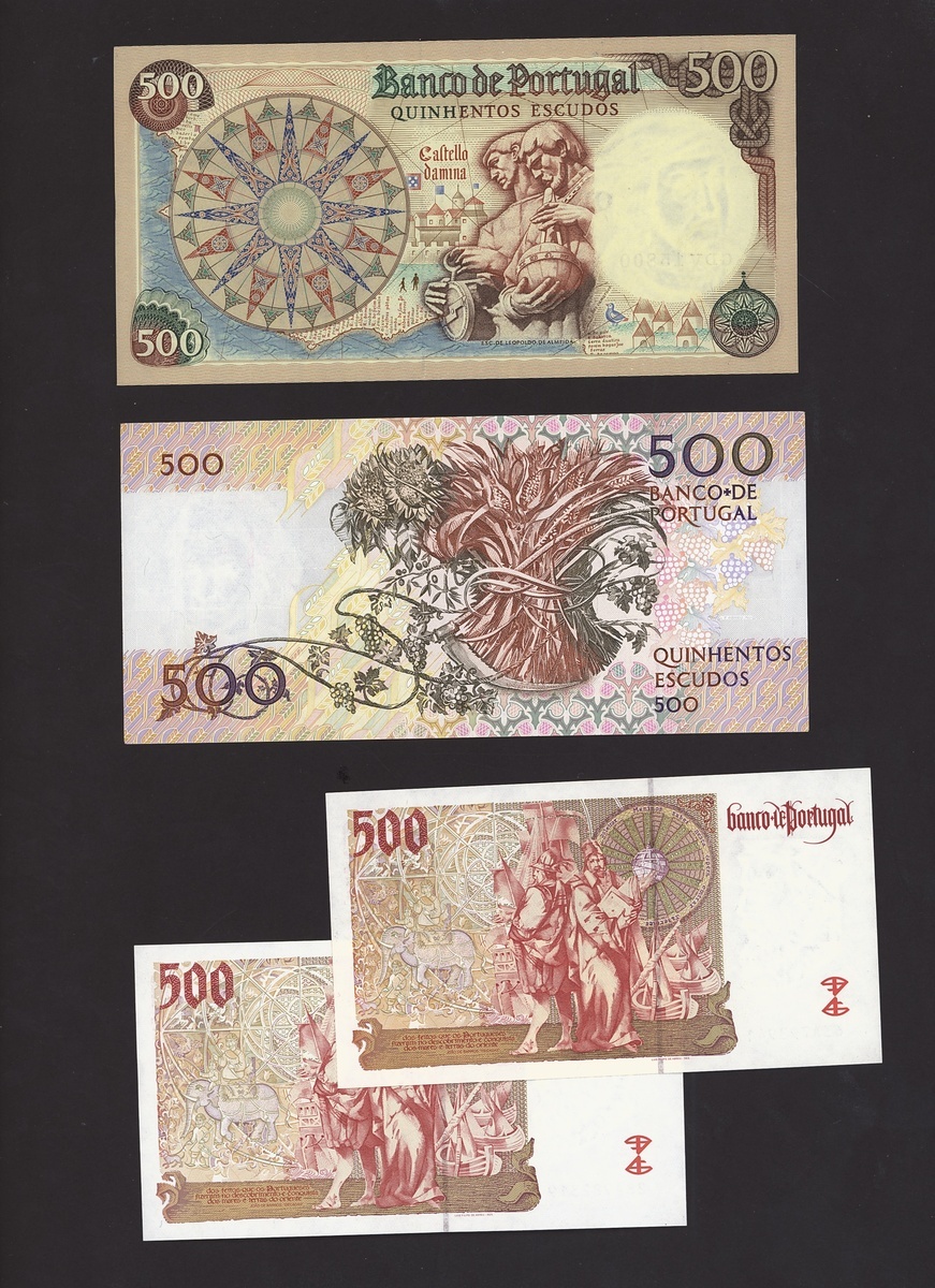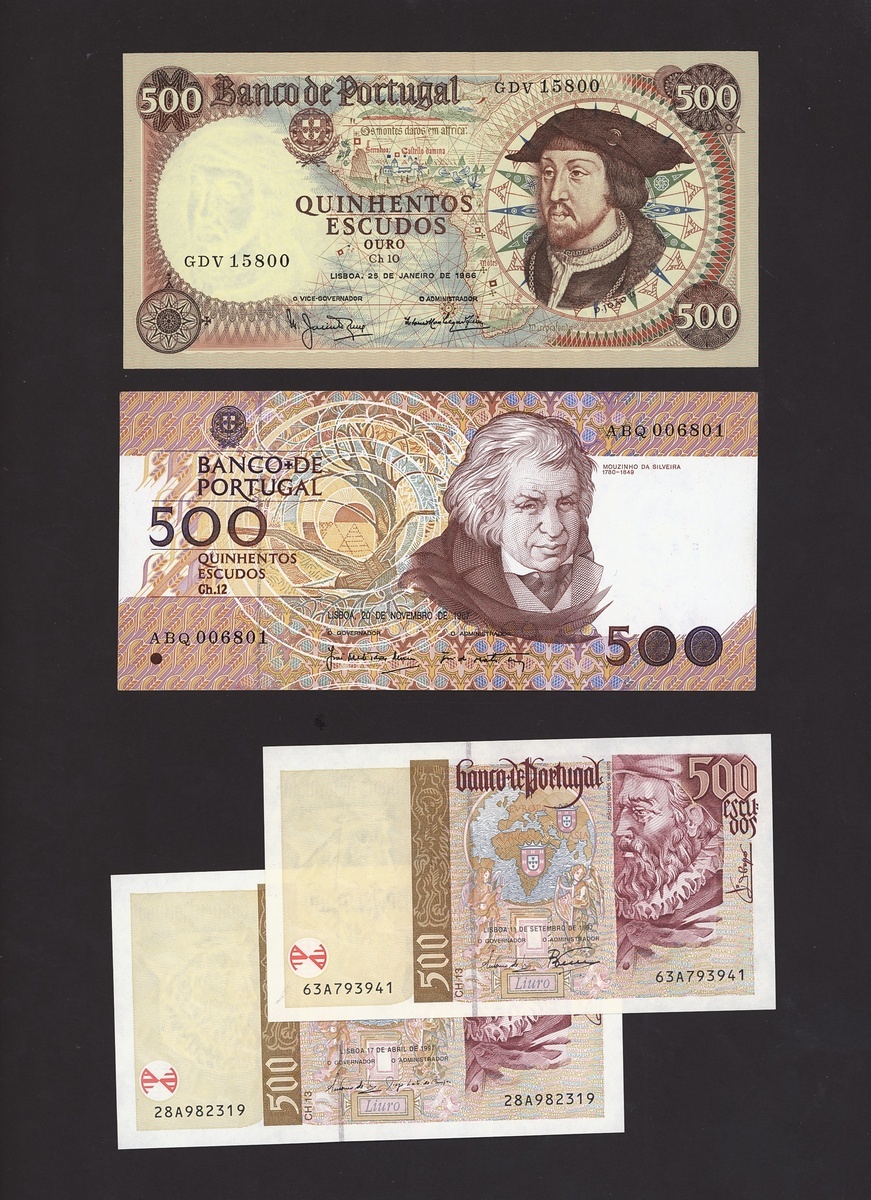 (x) Banco de Portugal, 500 escudos (4) 1966, 1967 and 1997 (2), all are purple and yellow and brown, Joao II, da Silveira and de Barros respectively