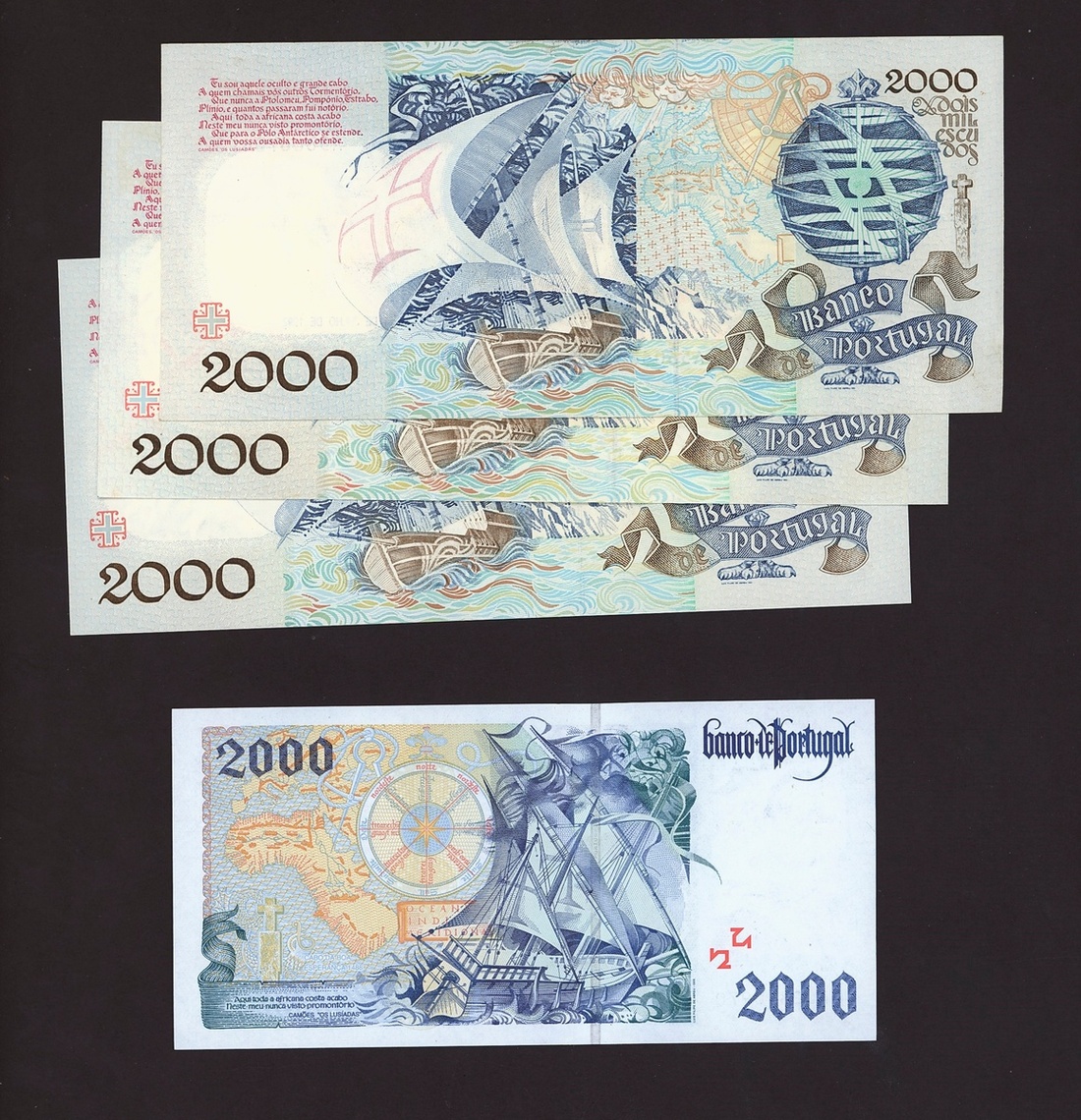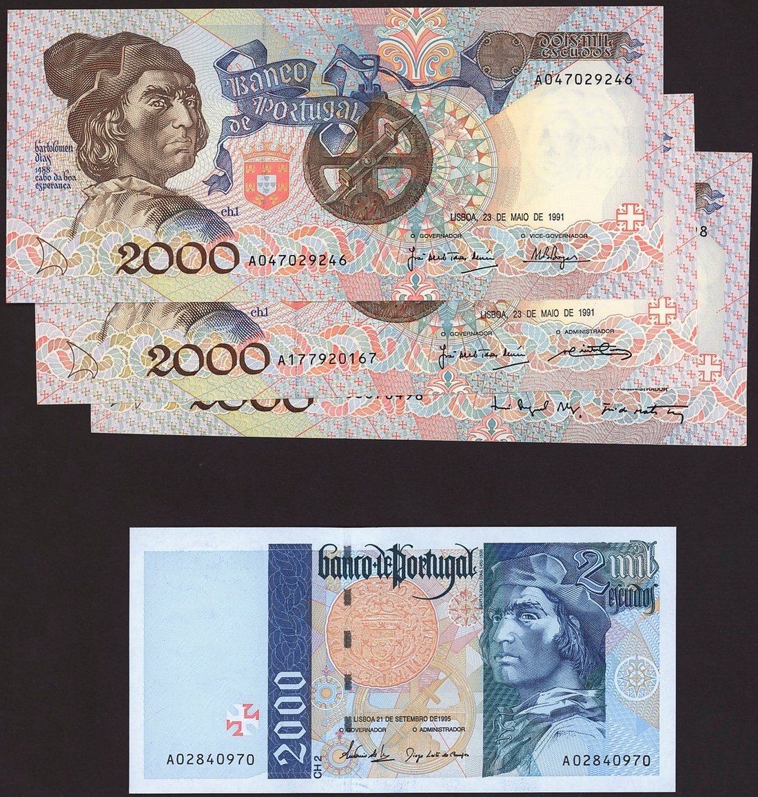 (x) Banco de Portugal, 2000 escudos (3), 1991, 1992, Ch.1, both prefix A, pink, blue and multicoloured, Bartolomeu Dias at left, also 2000 escudos, 1995