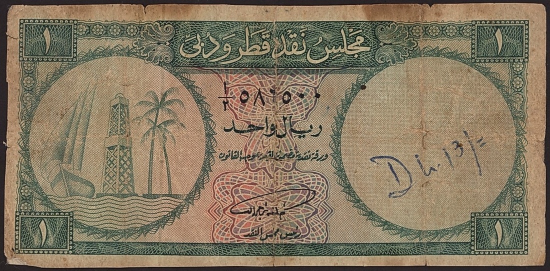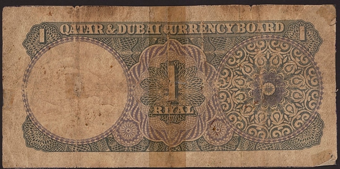 (x) Qatar & Dubai Currency Board, 1 riyal, ND (ca. 1960), serial number 580500, (Pick 1a), split in the middle, tape, very good