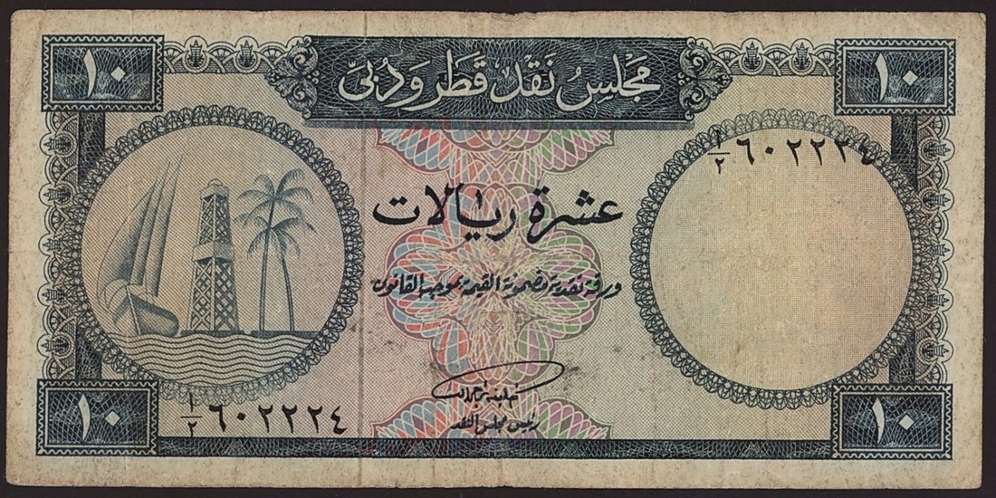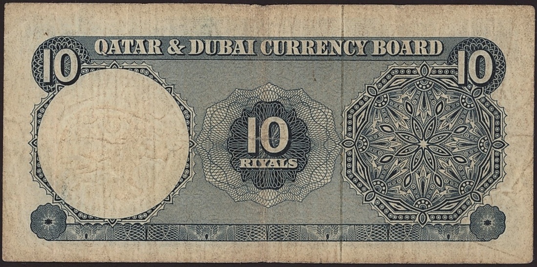 Qatar & Dubai Currency Board, 10 riyals, 1966, serial number 1/2 602224, (Pick 3, BNB B103), fine