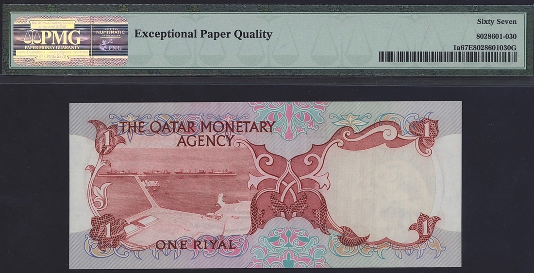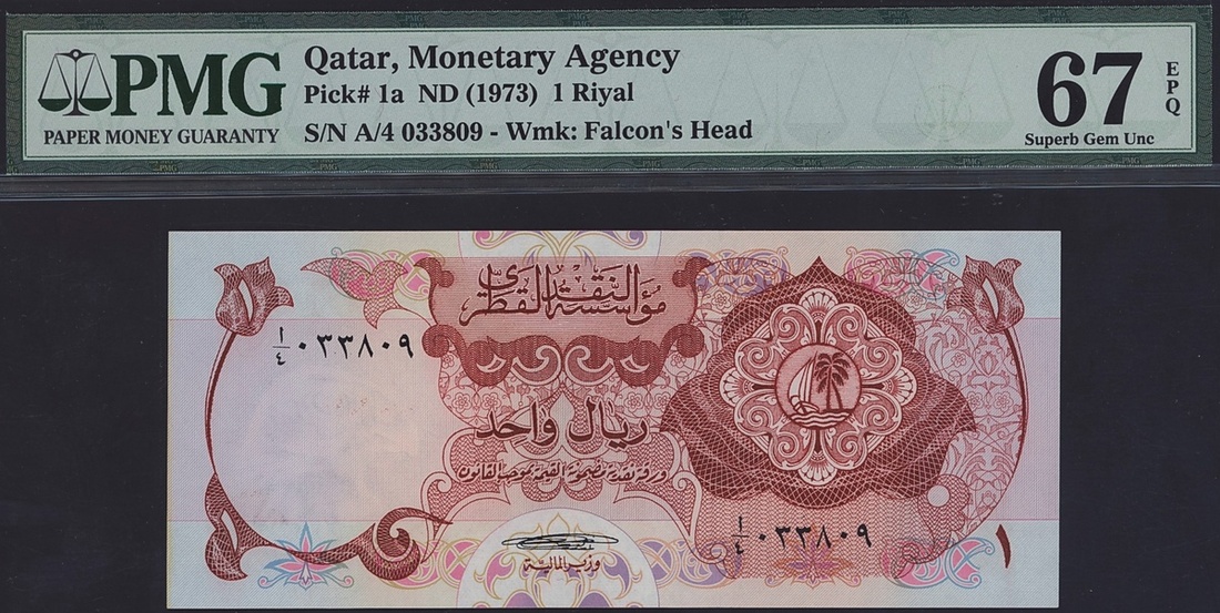 (x) Monetary Agency, Qatar, 1 riyal, ND (1973), serial number A/4 033809, (Pick 1a), In PMG holder 67 EPQ Superb Gem Uncirculated