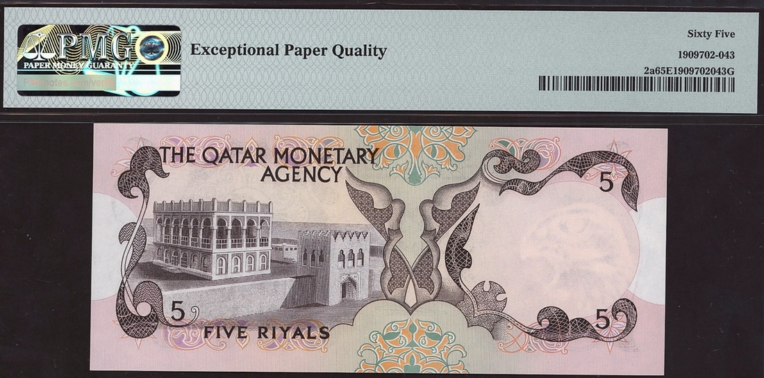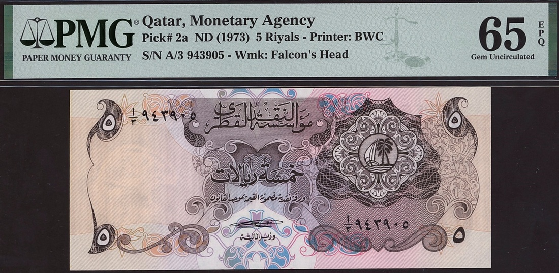 (x) Qatar Monetary Agency, 5 riyals, ND (1973), serial number A/3 943905, (Pick 2a, BNB 102), in PMG holder 65 EPQ Gem Uncirculated