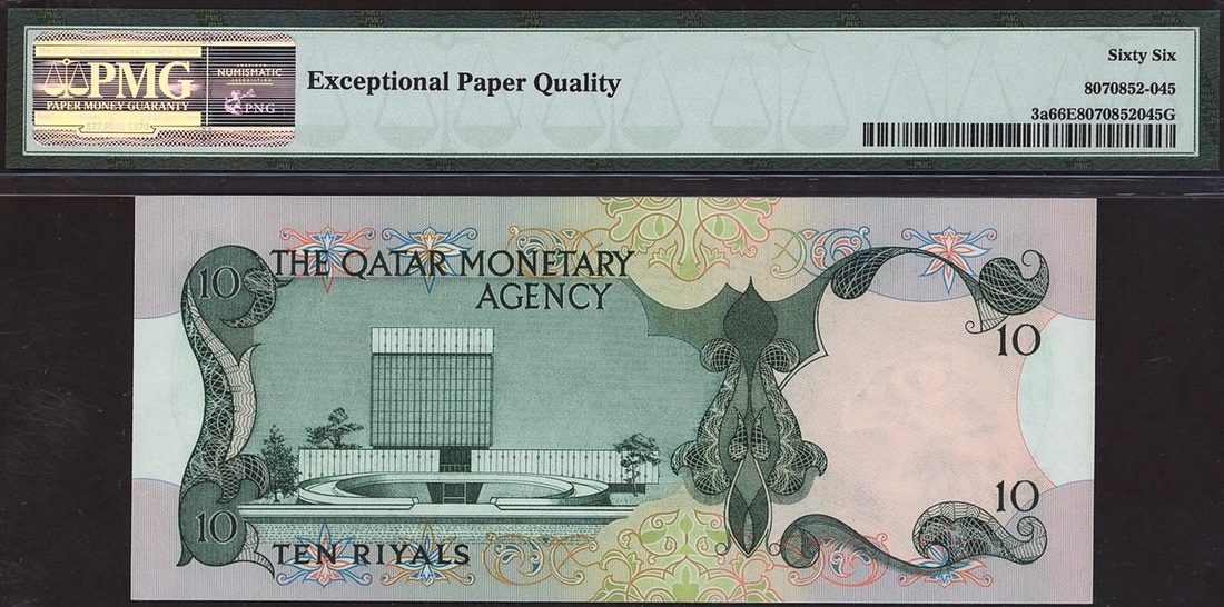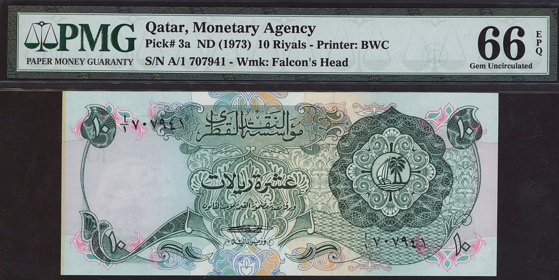 (x) Qatar Monetary Agency, 10 riyals, ND (1973), serial number A/1 707941, (Pick 3a), in PMG holder 66 EPQ Gem Uncirculated