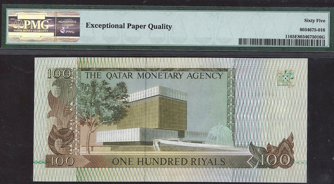 (x) The Qatar Monetary Agency, 100 riyals, ND (ca. 1980), serial number B/3 077665, (Pick 11), in PMG holder 65 EPQ Gem Uncirculated