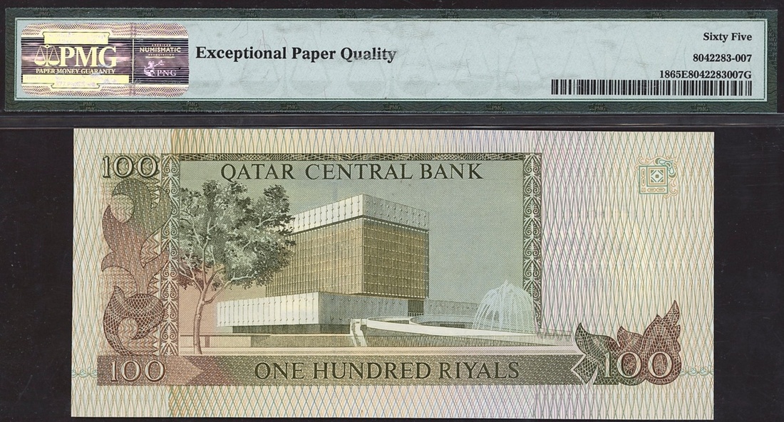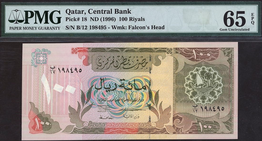 (x) Qatar Central Bank, 100 riyals, ND (1996), serial number B/12 198495, (Pick 18), in PMG holder 65 EPQ Gem Uncirculated
