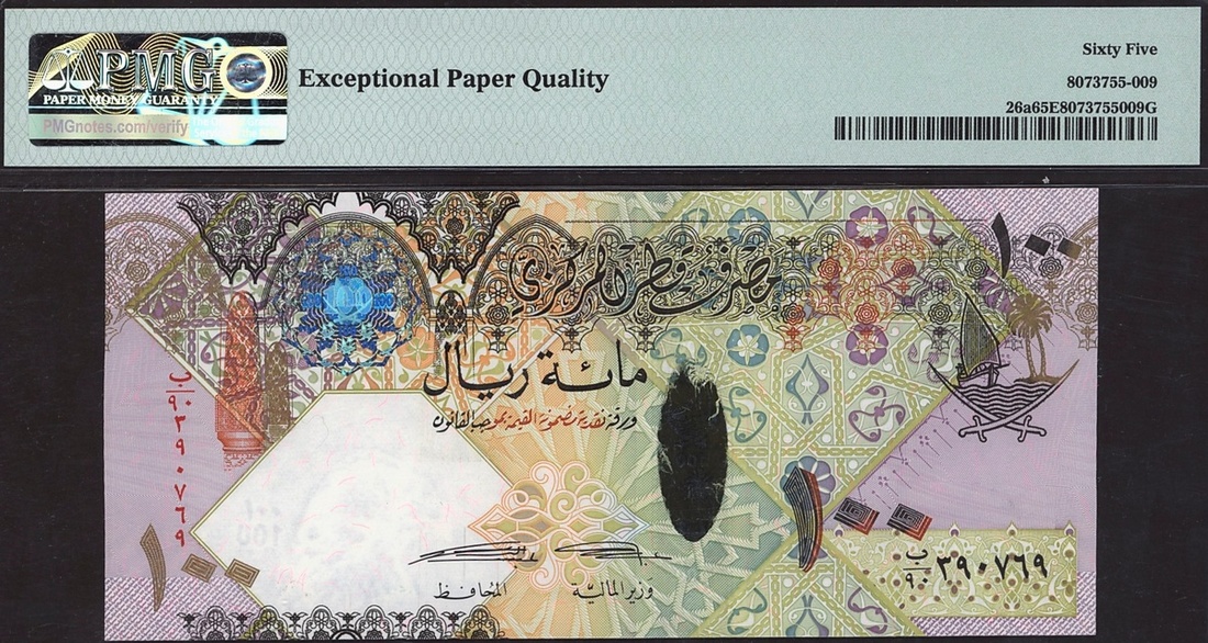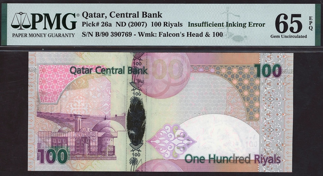 (x) Central Bank of Qatar, insufficient inking error 100 riyals, ND (2007), serial number B/90 390769, (Pick 26a), in PMG holder 65 EPQ Gem Uncirculated, scarce