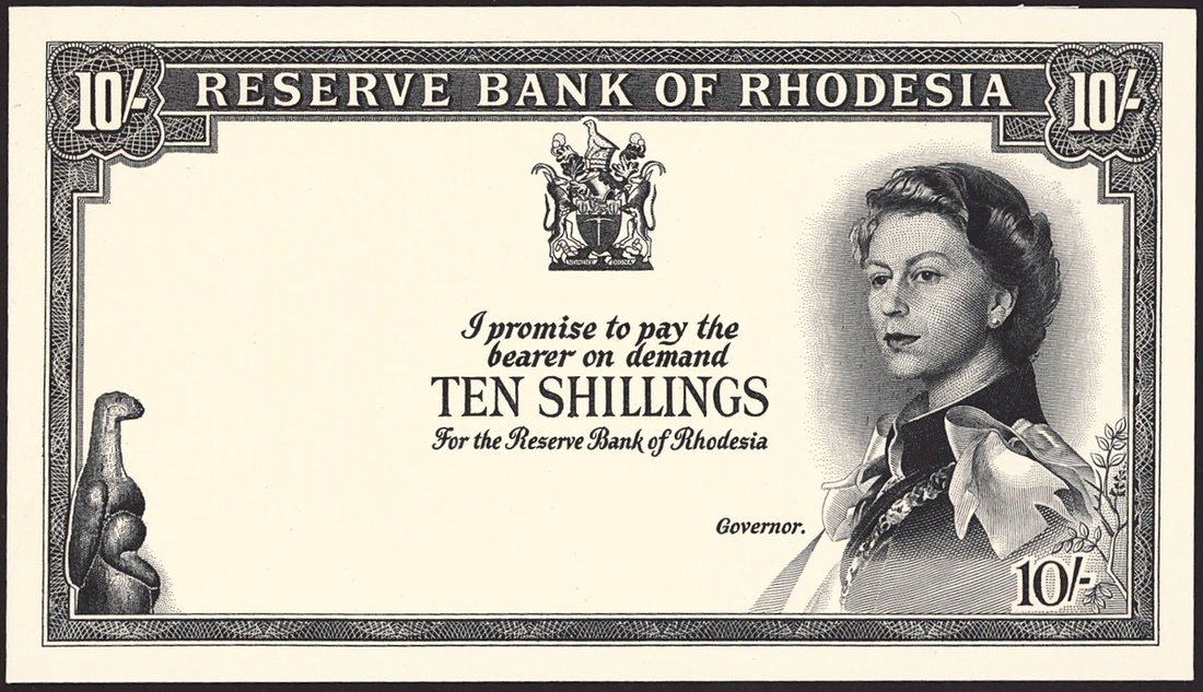 Reserve Bank of Rhodesia, uniface black and white die proof of 10 shillings, ND (1964), black on cream card, bird at left, Queen Elizabeth II at right, reverse, tobacco field,