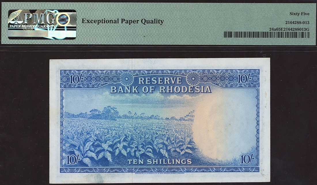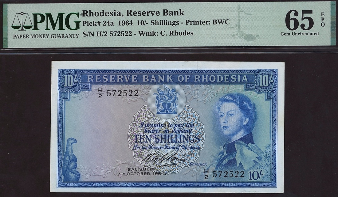 Reserve Bank, Rhodesia, 10 shillings, 1964, serial number H/2 572522, (Pick 24a), in PMG holder EPQ 65 Gem Uncirculated.