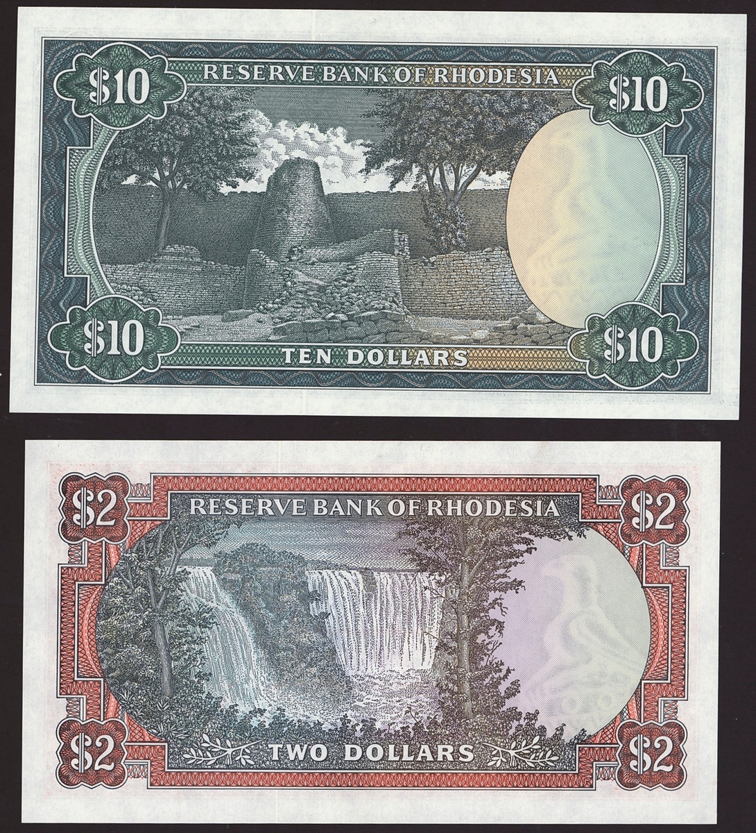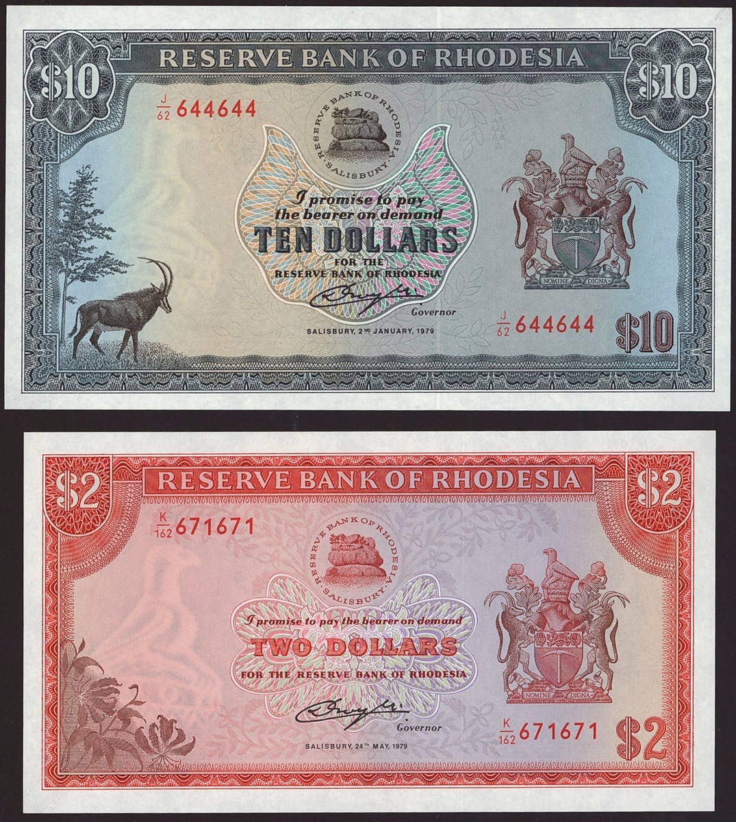 Reserve Bank of Rhodesia, $10, 2 January 1979, repeater serial number J/62 644644, also a $2 1979, repeater serial number K/162 671671,