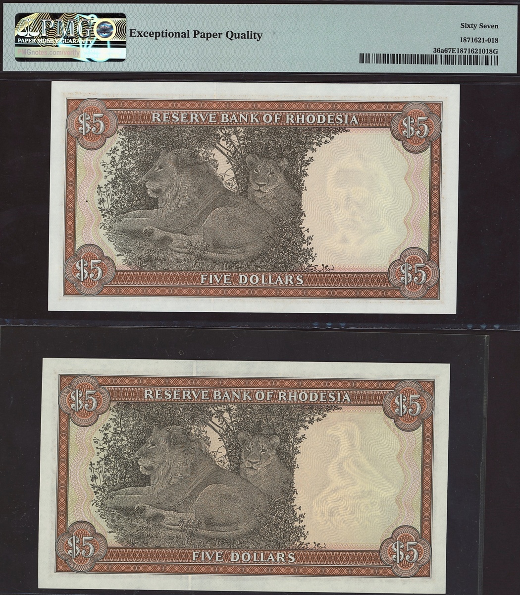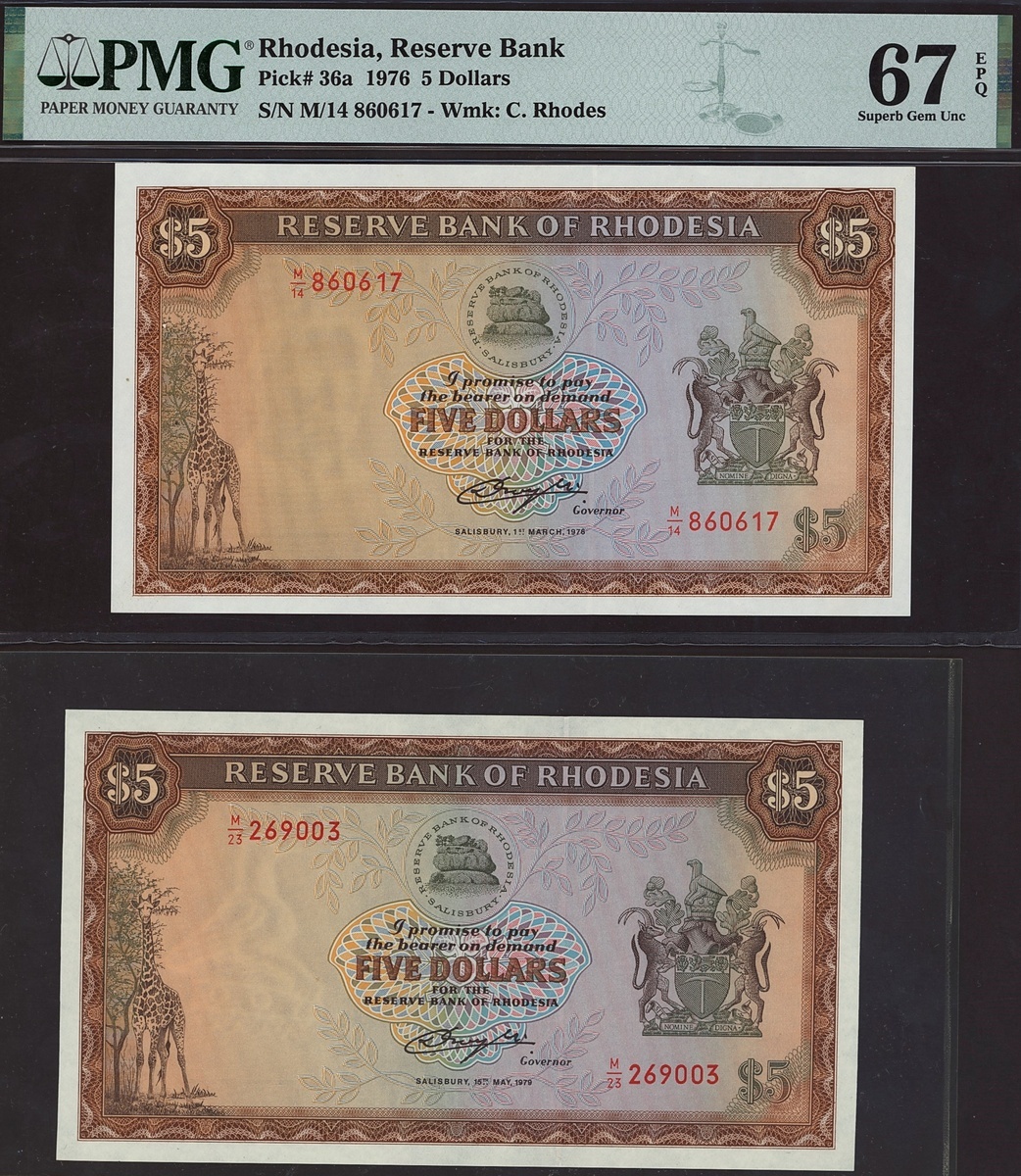 (x) Reserve Bank of Rhodesia, 5 dollars (2), 1976, 1979, prefixes M/14, M/23, (Pick 36a, 40a), in PMG holder 67 EPQ Superb Gem Unc and uncirculated respectively (2 notes)