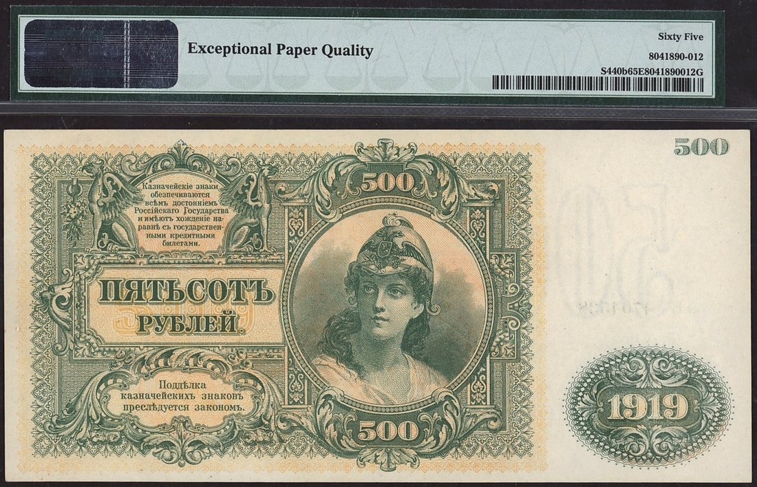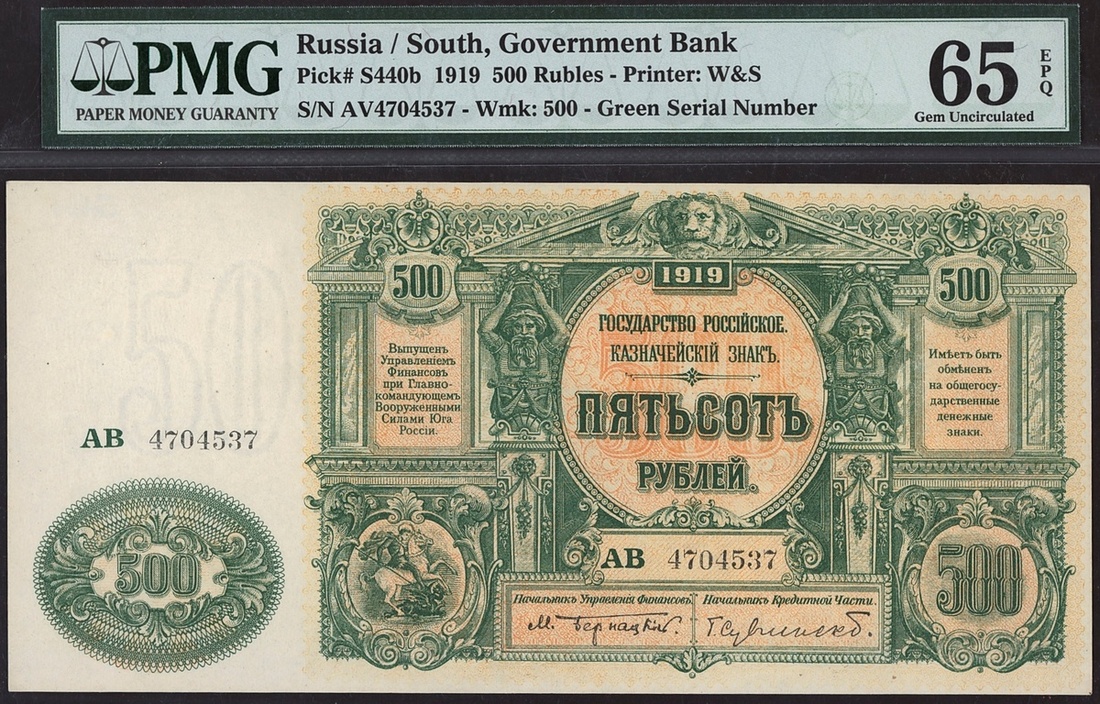 (x) Russia, South Government Bank, 500 rubles, 1919, serial number AV4704537, (Pick S440b), in PMG holder 65 EPQ Gem Uncirculated