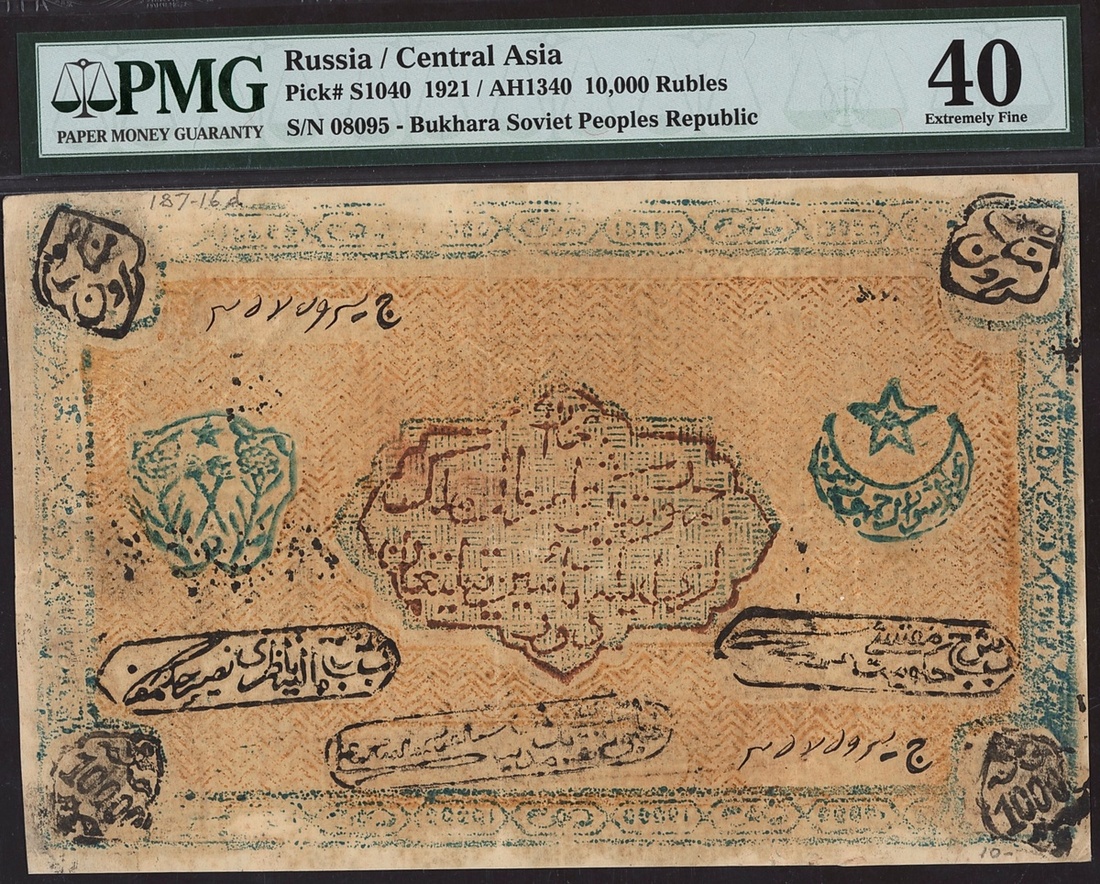 (x) Russia, Central Asia, Bukhara Soviet Peoples Republic, 10,000 rubles, 1921, serial number 08095, (Pick S1040), in PMG holder 40 Extremely Fine, annotations, high grade for type