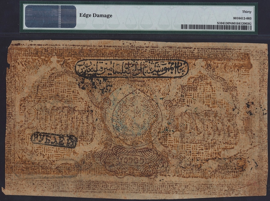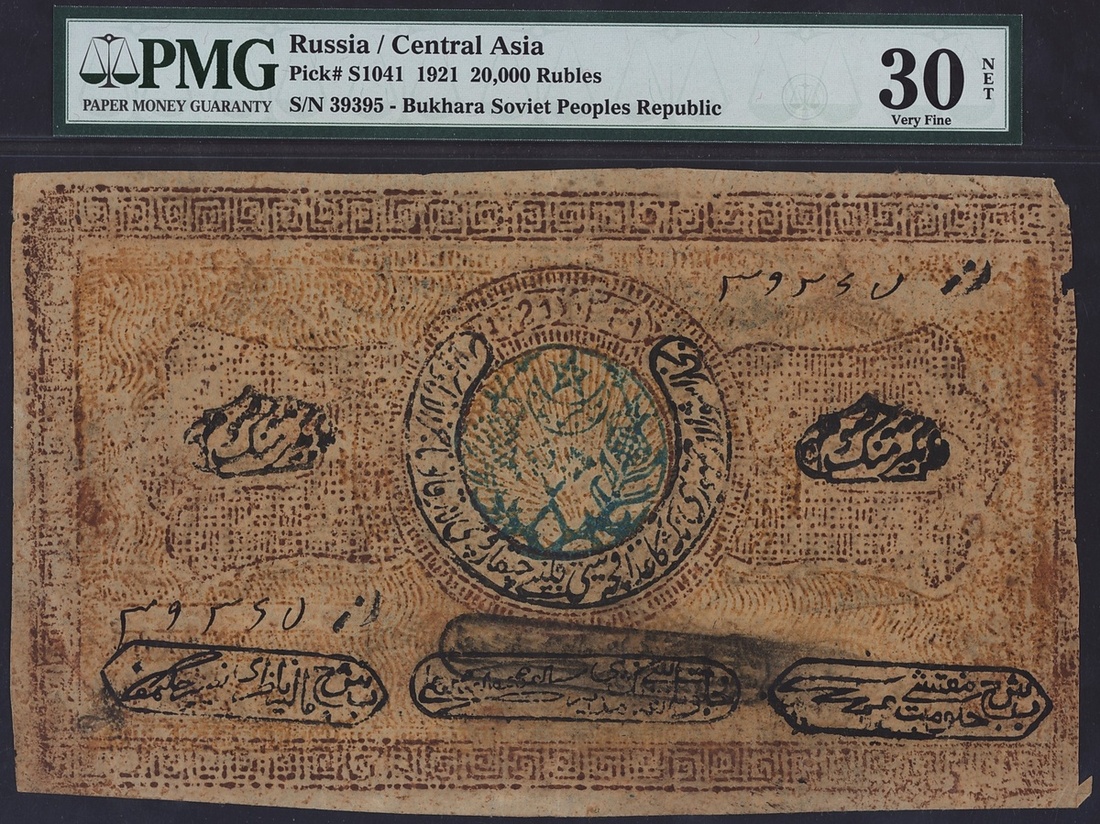 (x) Russia, Central Asia, Bukhara Soviet Peoples Republic, 20,000 rubles, 1921, serial number 39395, (Pick S1041), in PMG holder 30 NET Very Fine, edge damage