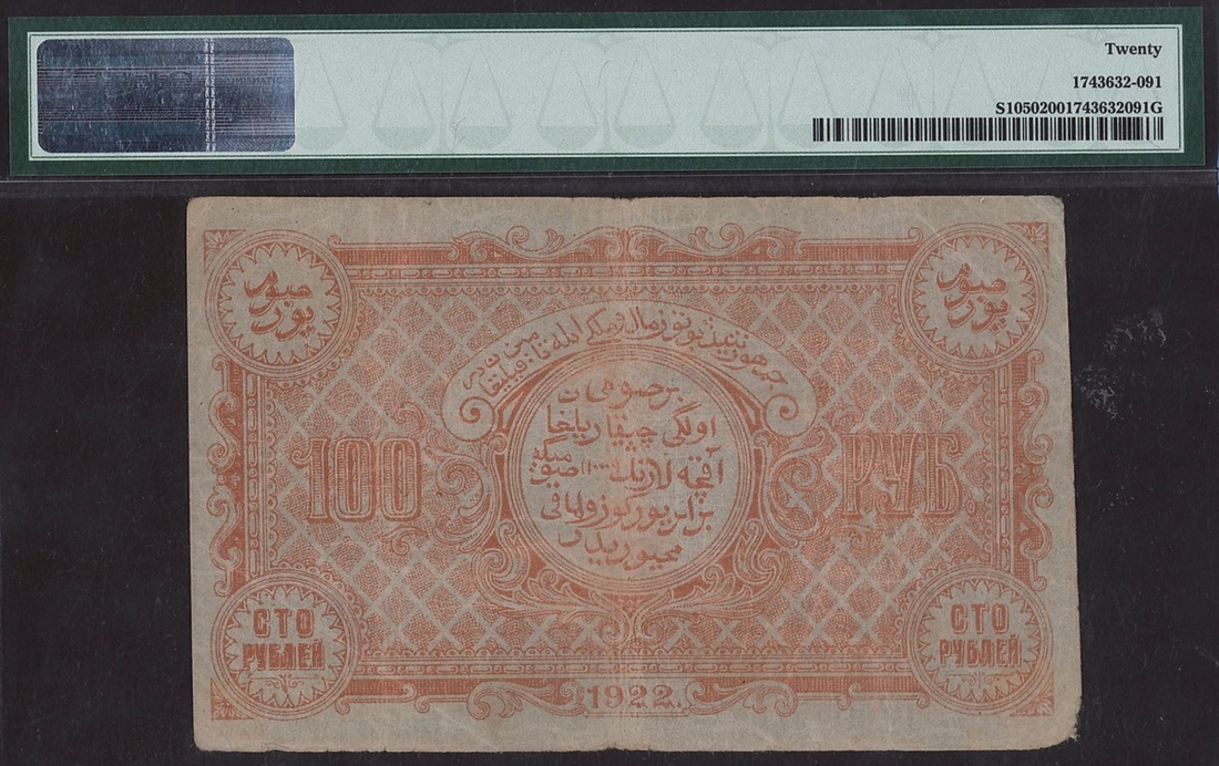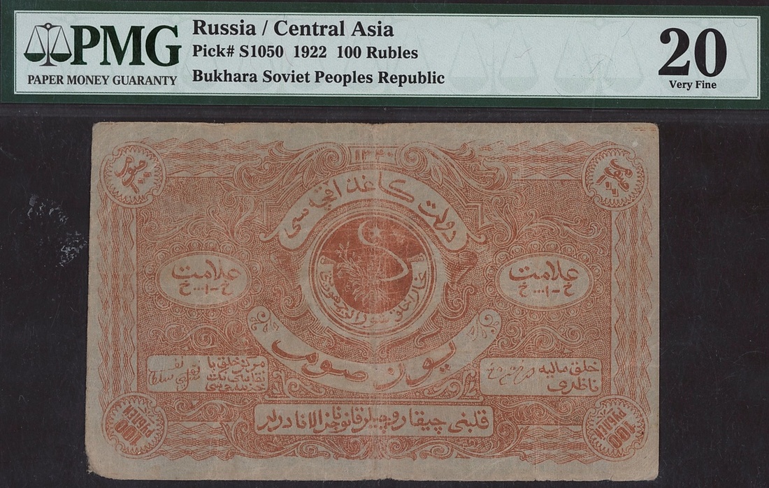 (x) Russia, Central Asia, Bukhara Soviet Peoples Republic, 100 rubles, 1922, (Pick S1050), in PMG holder 20 Very Fine