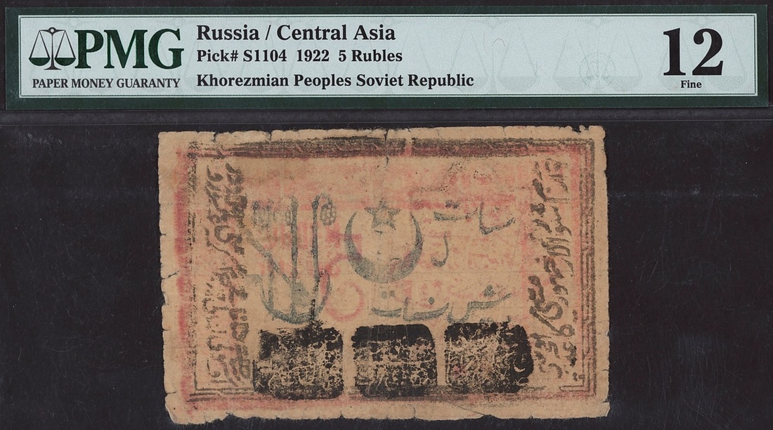 (x) Russia, Central Asia, Khorezmian Peoples Soviet Republic, 5 rubles, 1922, (Pick S1104), in PMG holder 12 Fine