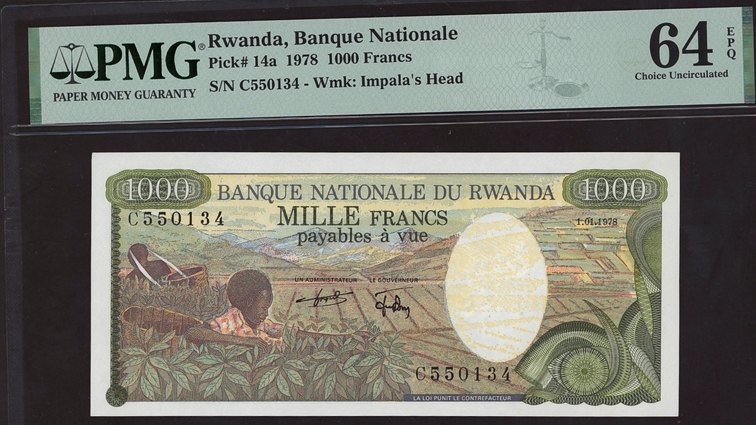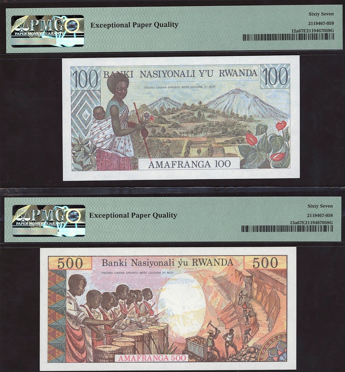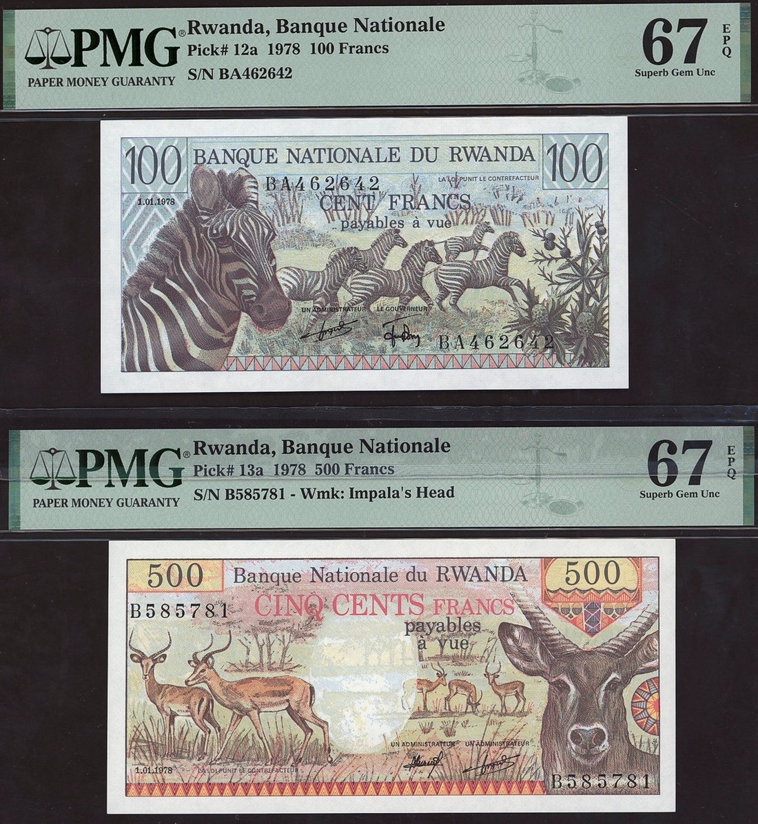 (x) Banque Nationale du Rwanda, a partial set of the 1978 issue, including 100, 500 and 1000 francs, (Pick 12a, 13a, 14a), in PMG holders 67, 67, 64 (3 notes)