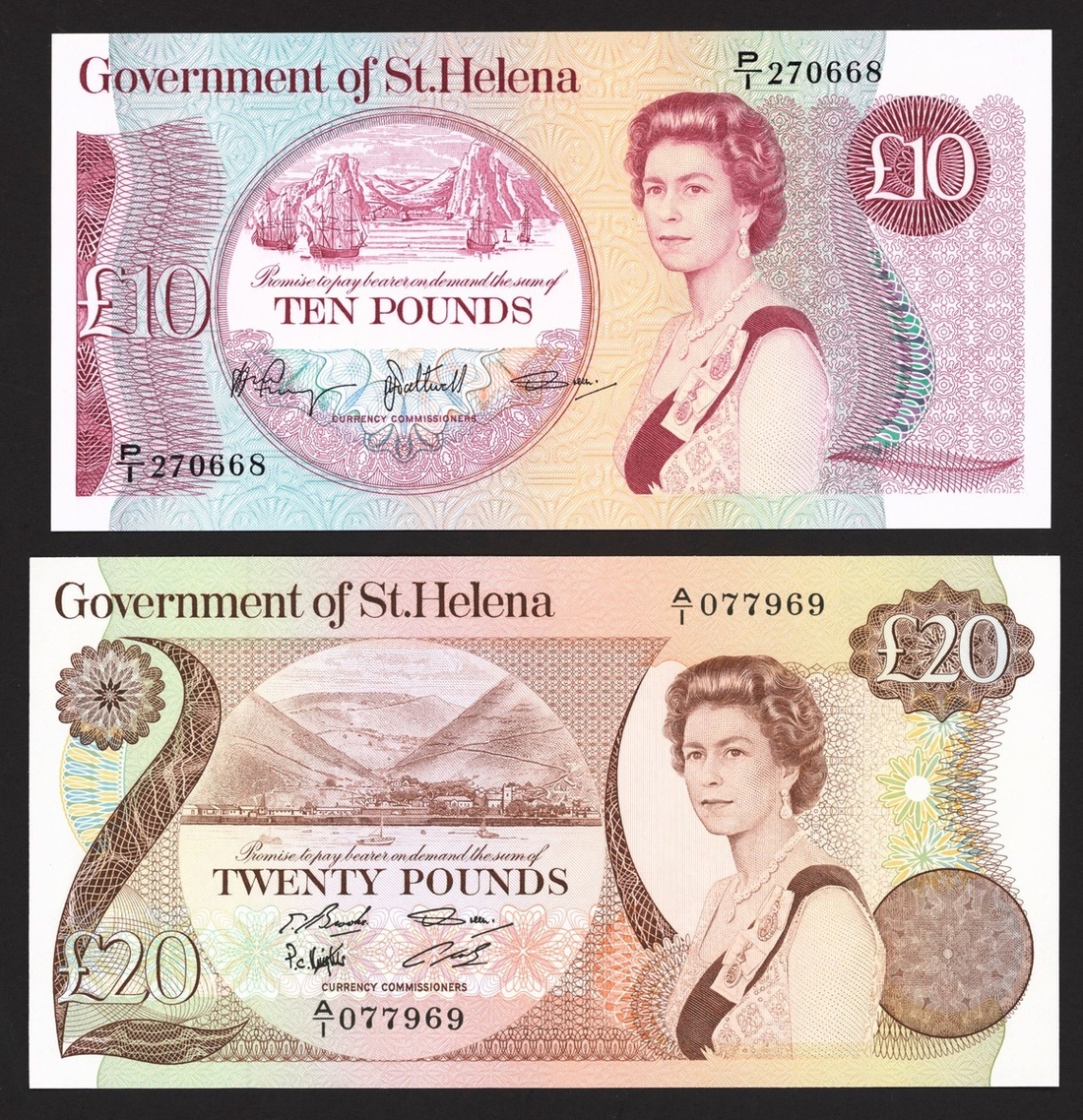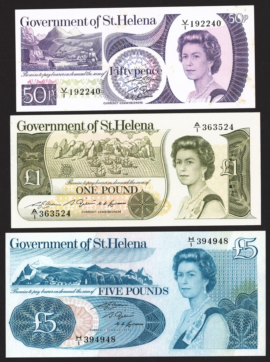 (x) Government of St. Helena, a group including 50 pence, £5, £10, 1976-85, and £1 and £20, 1981,
