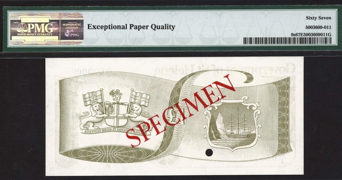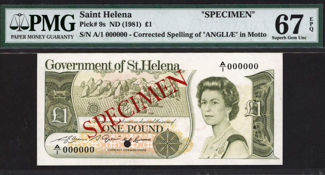 (x) Government of St. Helena, [Top Pop] specimen £1, ND (1981), serial number A/1 000000, (Pick 9s, BNB 305as), in PMG holder 67 EPQ Superb Gem Unc. One of two top pop examples
