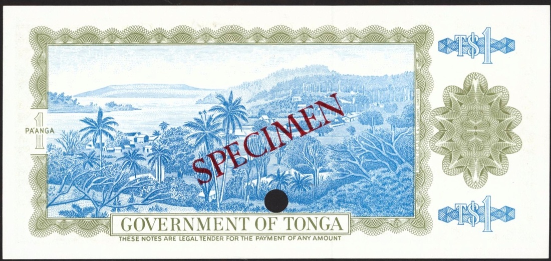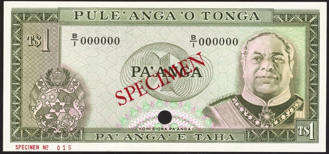 Government of Tonga, Tonga, Specimen 1 pa'anga, ND (1974-85), serial number B/1 000000, (Pick 19s), uncirculated, hole punch.