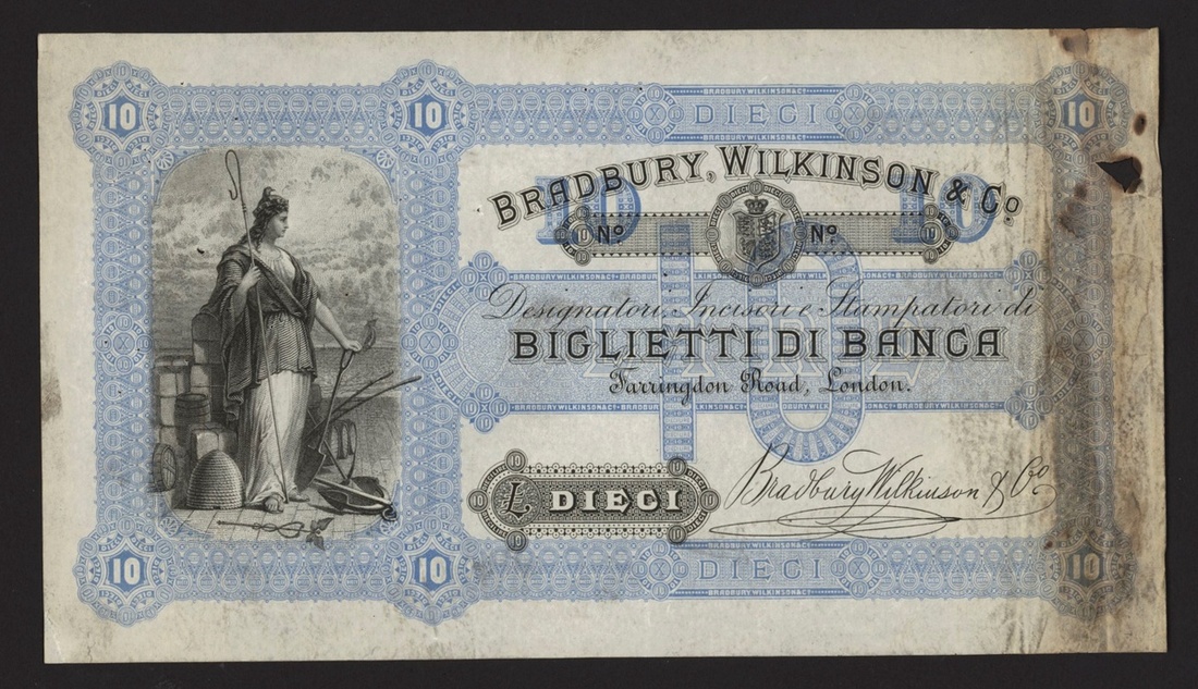 Bradbury, Wilkinson & Co, advertising note for 10 lire, ND (1890-1920 ca.), blue, allegorical figure at left,