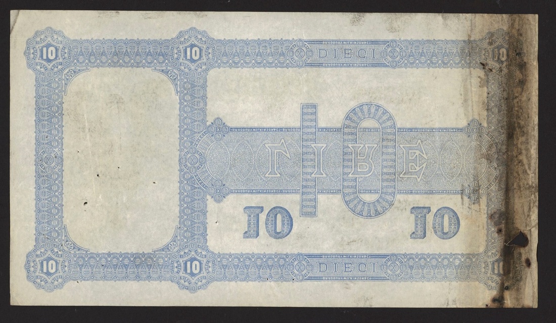 stain and holes at right margin, small holes and pinholes, good very fine, attractive and ornate note done in the style of an early Banca d'Italia note, rare