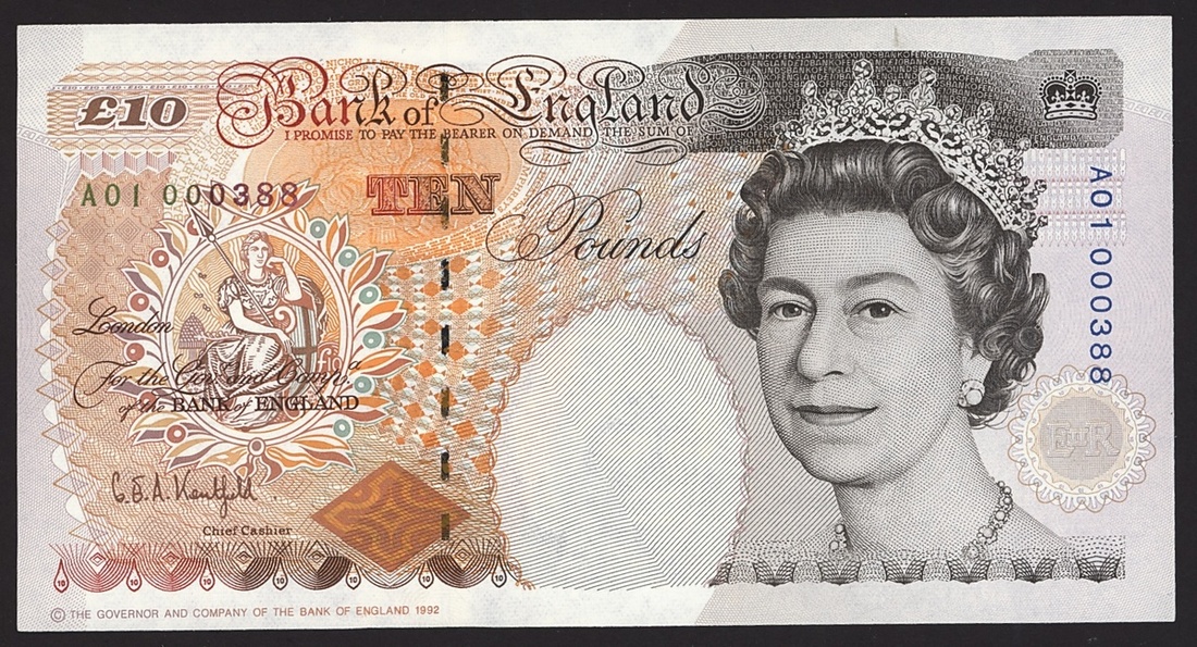 Bank of England, low serial 10 pounds, 1992, serial number A01 000388, (EPM B366, Pick 383a), uncirculated