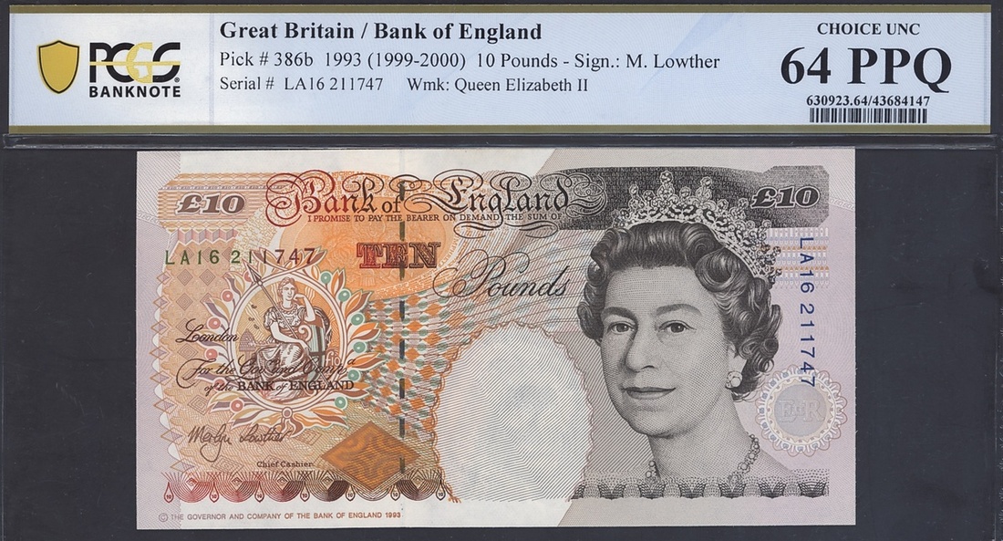 Bank of England, Great Britain, 10 pounds, 1993 (1999-2000), serial number LA16211747, (Pick 386b), in PCGS holder 64 PPQ Choice Uncirculated