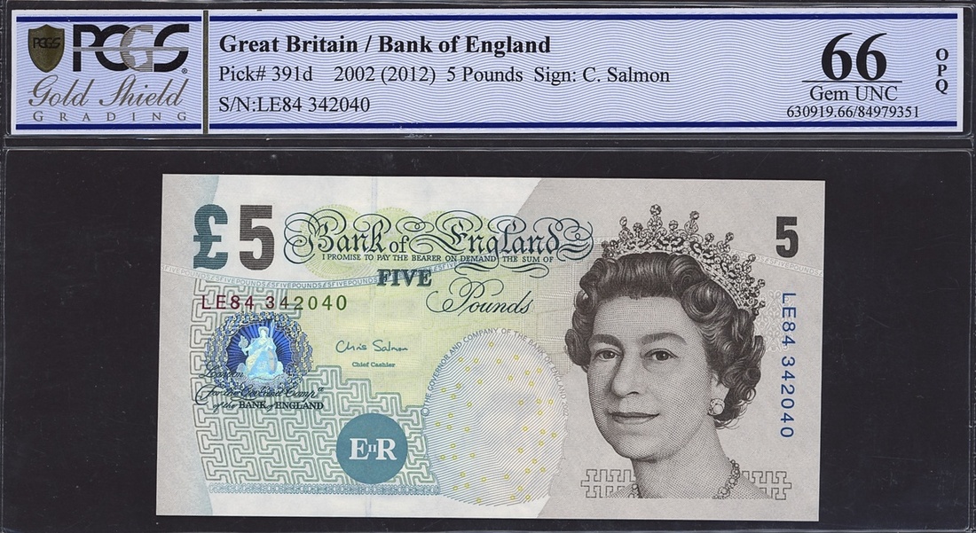Bank of England, Great Britain, 5 pounds, 2002 (2012), serial number LE84 342040, (Pick 391d), in PCGS holder 66 POQ Gem Uncirculated