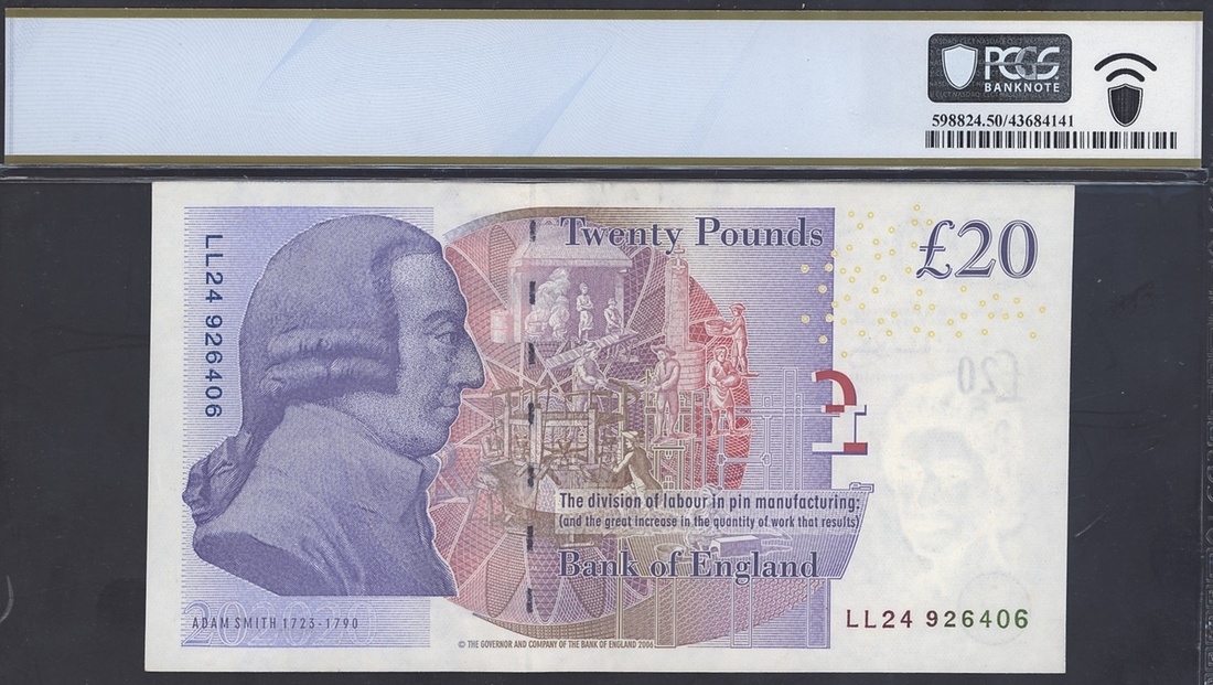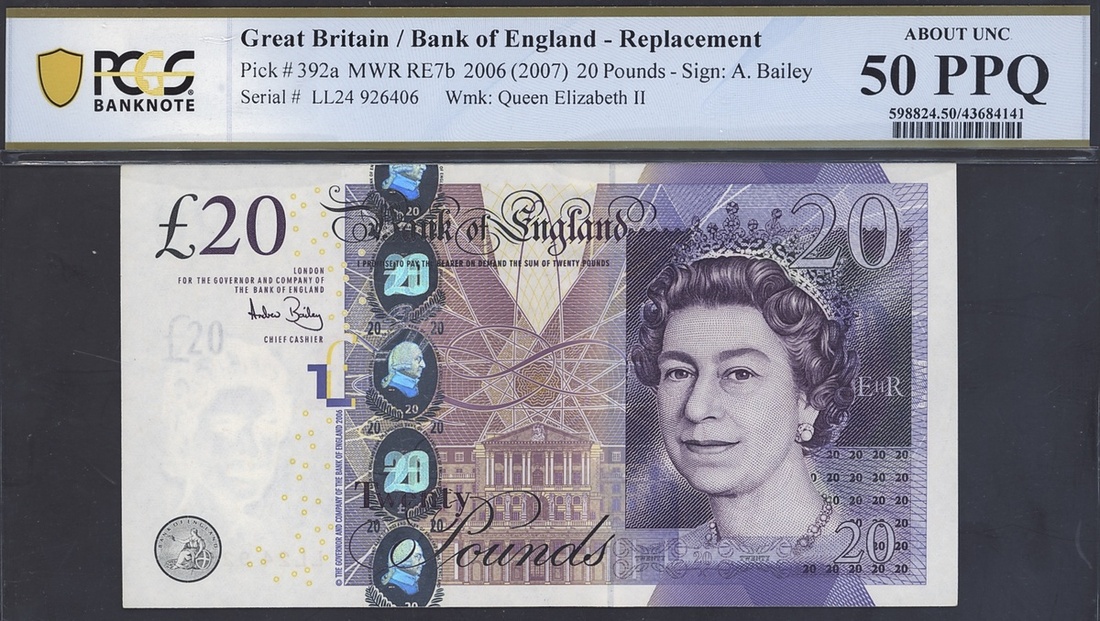 Bank of England, Great Britain, 20 pounds, 2006 (2007), serial number LL24 926406, (Pick 392a), in PCGS holder 50 PPQ About Uncirculated