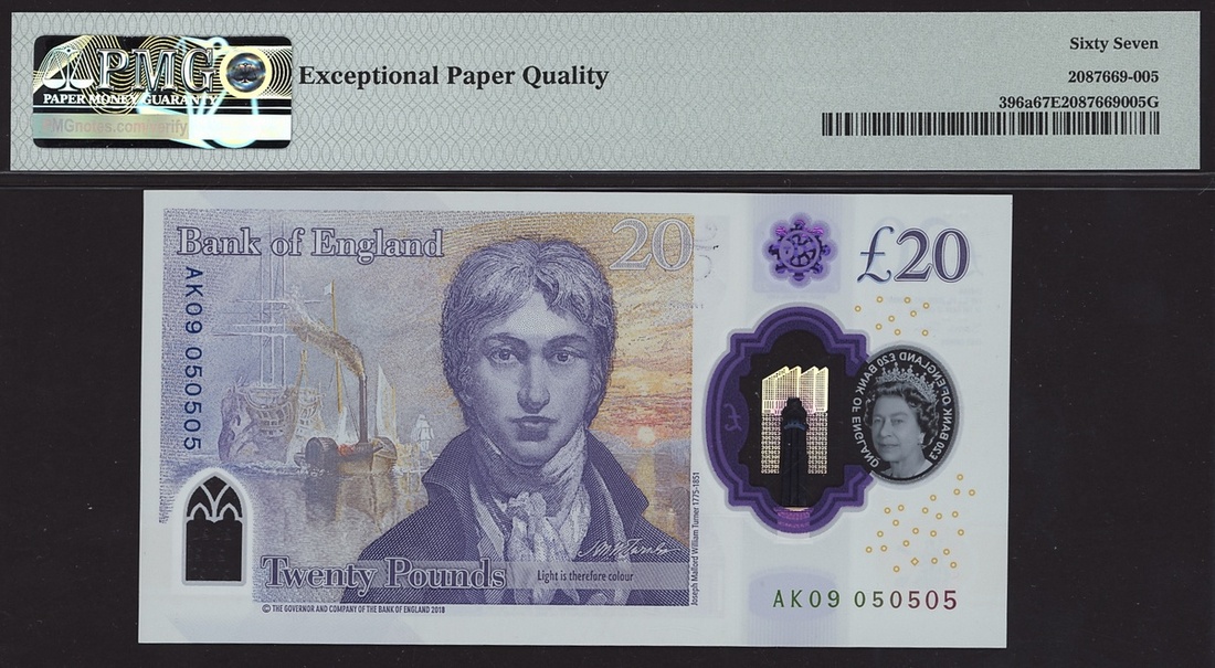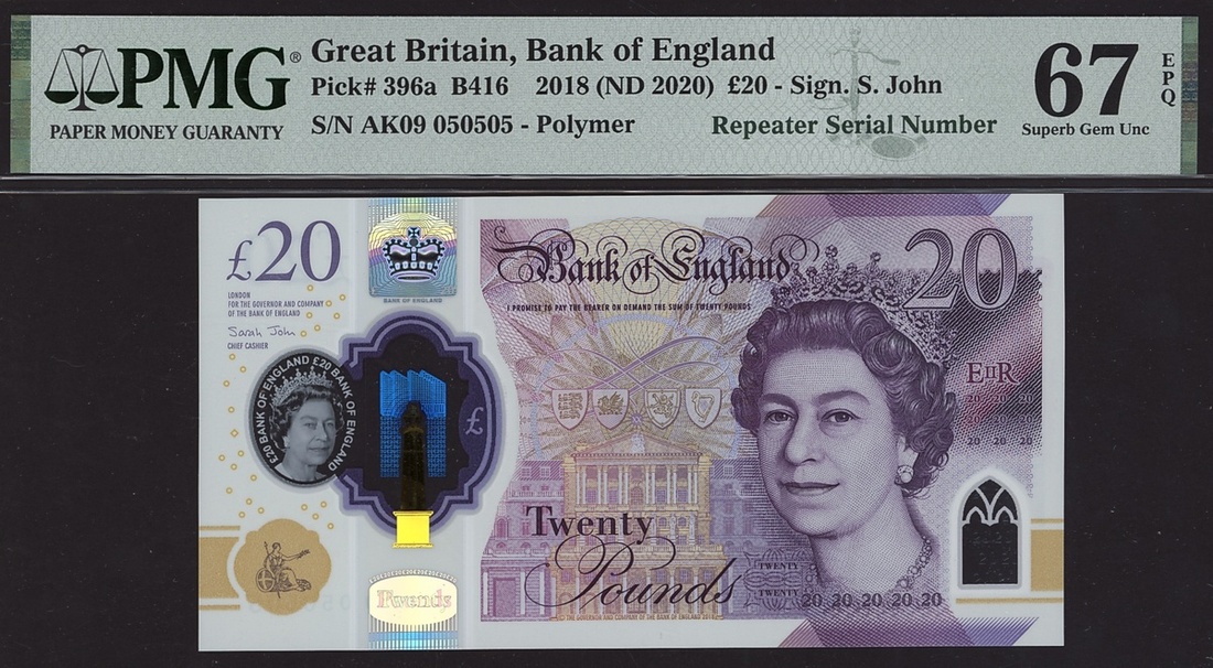 Bank of England, S. John, polymer £20, 2018 (ND 2020), repeater serial number AK09 050505, (EPM B416, Pick 396a), in PMG holder 67 EPQ Superb Gem Uncirculated